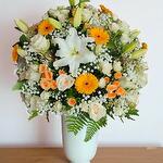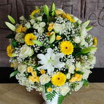 My Royal arrangement in a White ceramic pot; Indulge in the splendor of our Florists Specials! This stunning Arrangement harmoniously blends 5 fragrant white lilies, 10 vibrant yellow gerberas, 20 classic white roses, 10 clusters each of white and yellow spray roses, and 5 wispy sprigs of gypsophila. Brought together, they form a symphony of colors and scent that is sure to convey your sentiments in the most exquisite manner. A perfect function of nature and artistry!