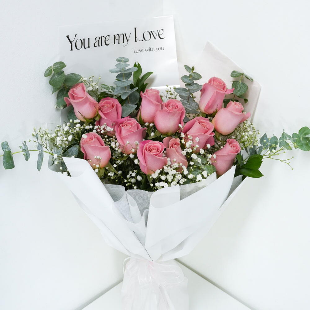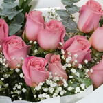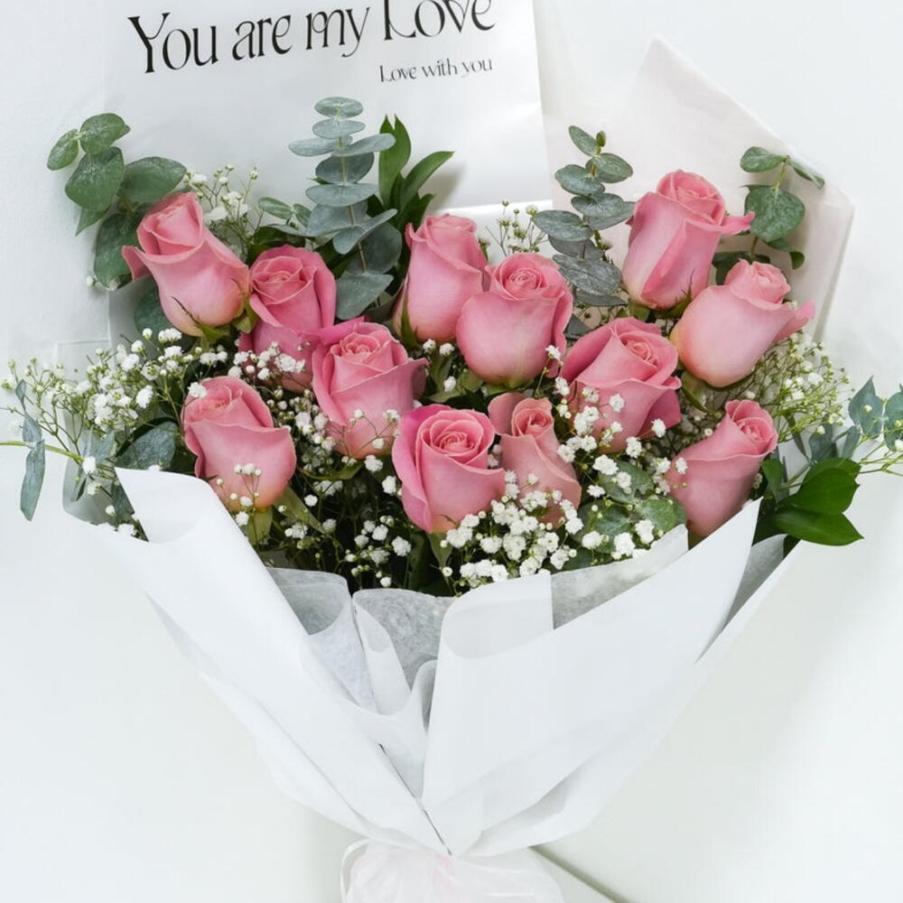 Immerse yourself in the delicate charm of our florists special bouquet. This arrangement beautifully combines 15 lustrous pink roses, adding a touch of romance and elegance. Complementing the roses, weve added 8 aromatic eucalyptus leaves for a touch of the sublime, with 3 clusters of gypsophila to create an enchanting cascade of tiny blooms. This bouquet is guaranteed to spread joy and convey heartfelt sentiments, whatever the occasion may be.