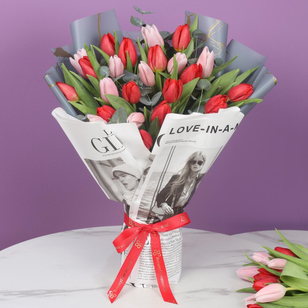 15 Red Tulips, 10 Pink Tulips, Leaves - 3 Stem Eucalyptus, Beautifully Wrapped in White Love in Mist and Grey Golden Marble Wrapping, Tied with Red Ribbon.