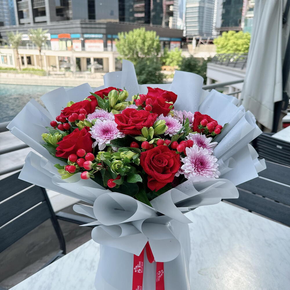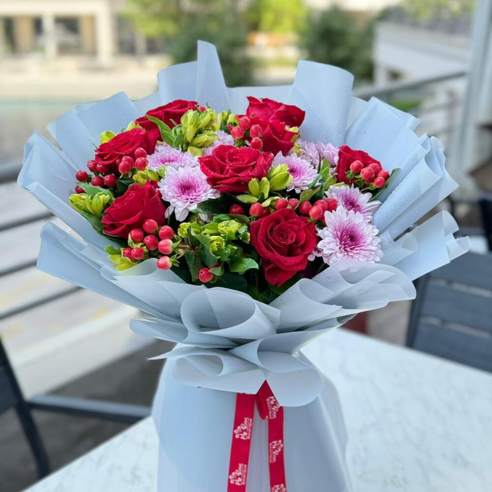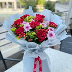 chrysanthemum pink - 4 pcs hypericum red - 6 pcs 8 red rose - 8 pcs yellow astromaria - 10 pcs