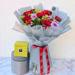 8 red Roses 10 yellow astromaria 4 chrysanthemum pink 6 hypericum red 250 grams patchi and a free greeting card