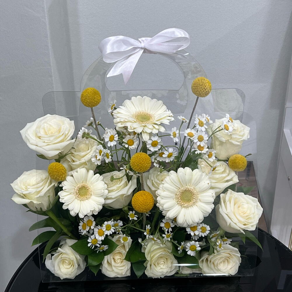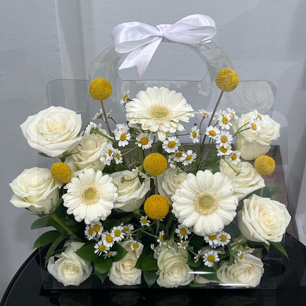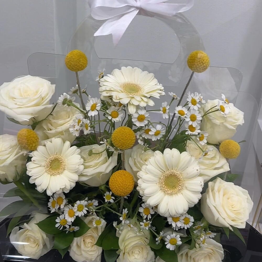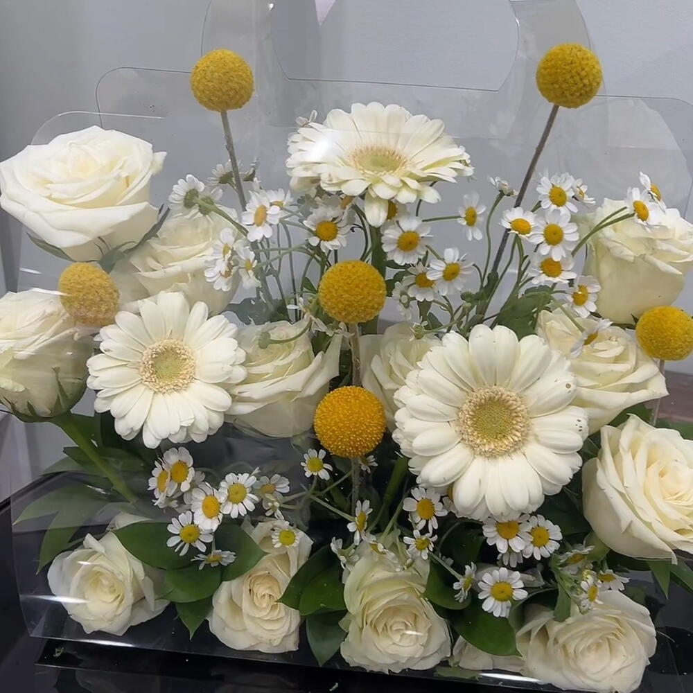 Gerbera - 3 pcs rose - 11 pcs craspedia - 6 pcs tanacetum - 5 pcs clear bag - 1 pcs