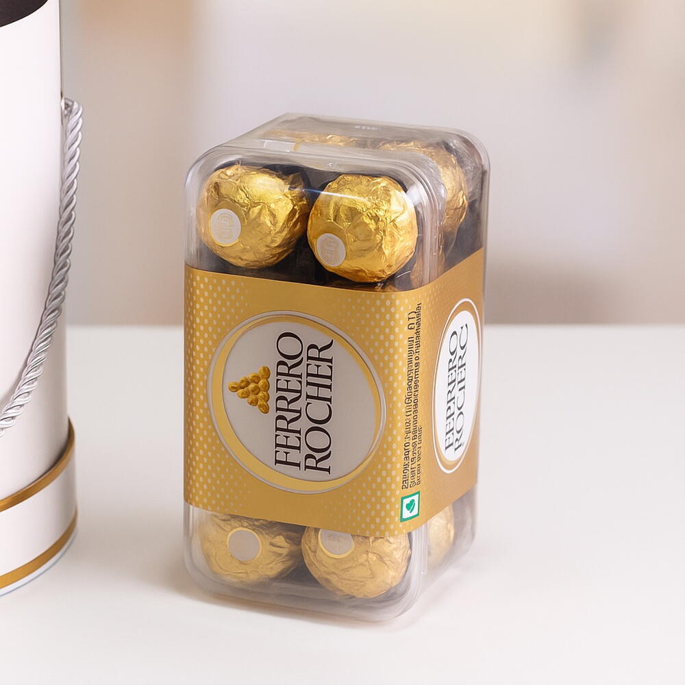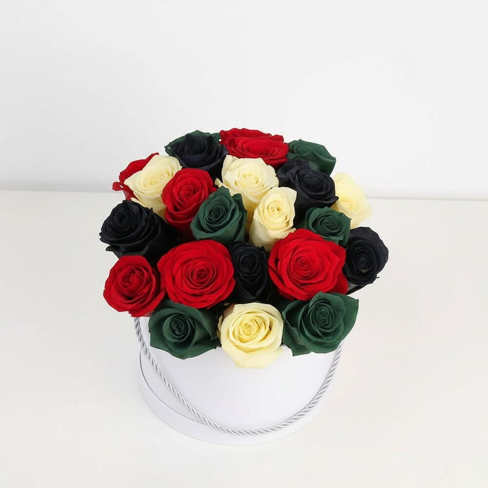 Red rose - 5 pcs White rose - 5 pcs white box - 1 pcs black sprayed rose - 5 pcs green sprayed rose - 5 pcs ferrero rocher chocolate box (16 piece) - 1 pcs
