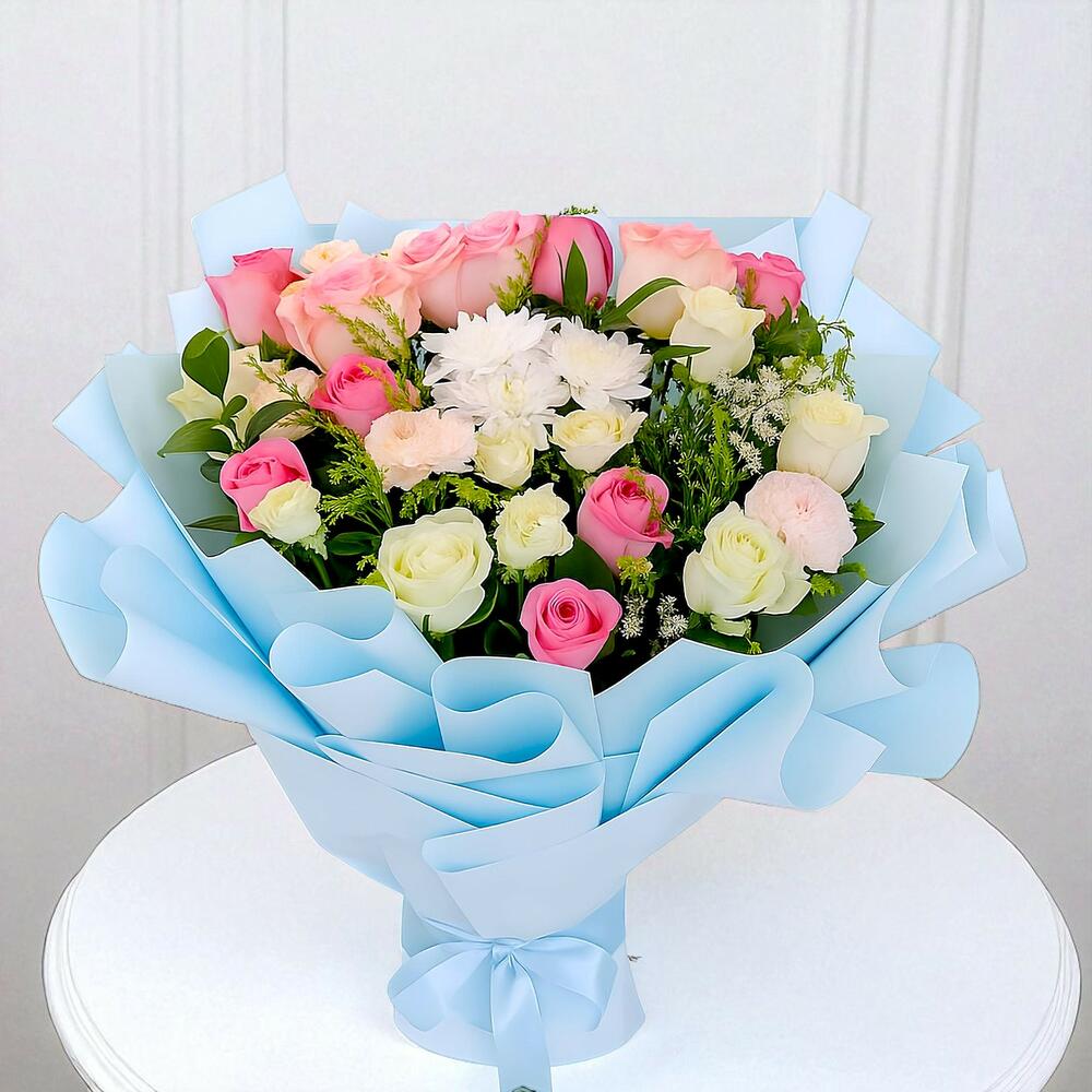 A delicate bouquet full of emotions, featuring a harmonious blend of roses, chrysanthemums, and green filler, elegantly wrapped in sky-blue paper. Perfect for welcoming a newborn or as a soft, warm-spirited congratulation