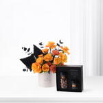 This striking creation features 10 radiant orange roses expressing admiration and warmth, paired with 4 vibrant orange carnations for depth and joy. 4 black eucalyptus stems and 3 black limonium sprigs add dramatic contrast, complemented by 4 ruscus stems and 2 dried palm leaves for structure and balance. Tucked beside the blooms is an indulgent duo from Lakrids by Bülow — D – Salted Caramel (Regular) and A – The Original (Small) — combining silky licorice, smooth caramel, and fine chocolate for a luxurious Northern touch. A refined harmony of color and flavor, crafted to elevate every occasion.