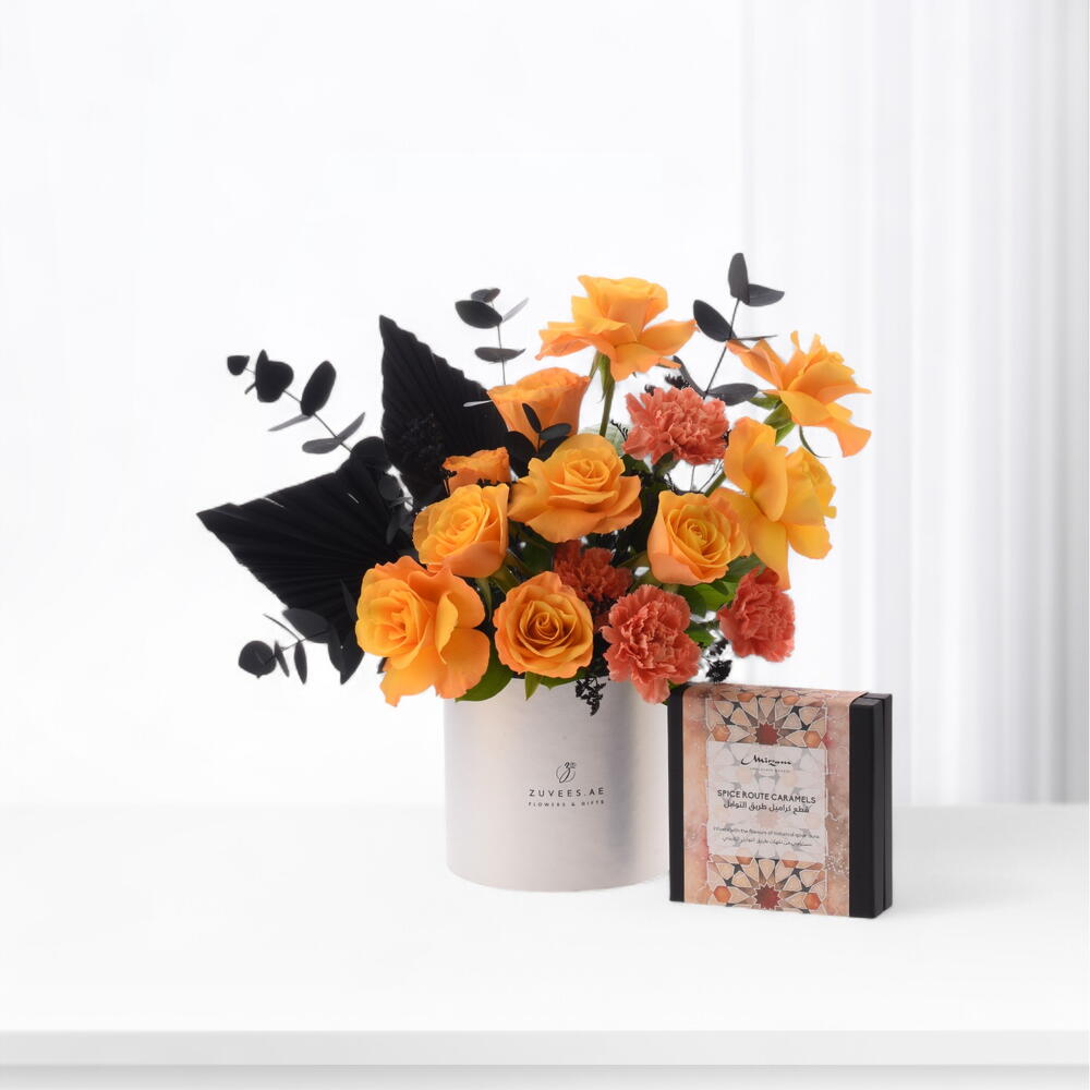 This striking creation features 10 radiant orange roses expressing admiration and warmth, paired with 4 vibrant orange carnations for depth and joy. 4 black eucalyptus stems and 3 black limonium sprigs add dramatic contrast, complemented by 4 ruscus stems and 2 dried palm leaves for structure and texture. Tucked beside the blooms is a box of Mirzam – Spice Route Caramels, handcrafted in Dubai and infused with exotic spices and velvety caramel for a truly artisanal touch.