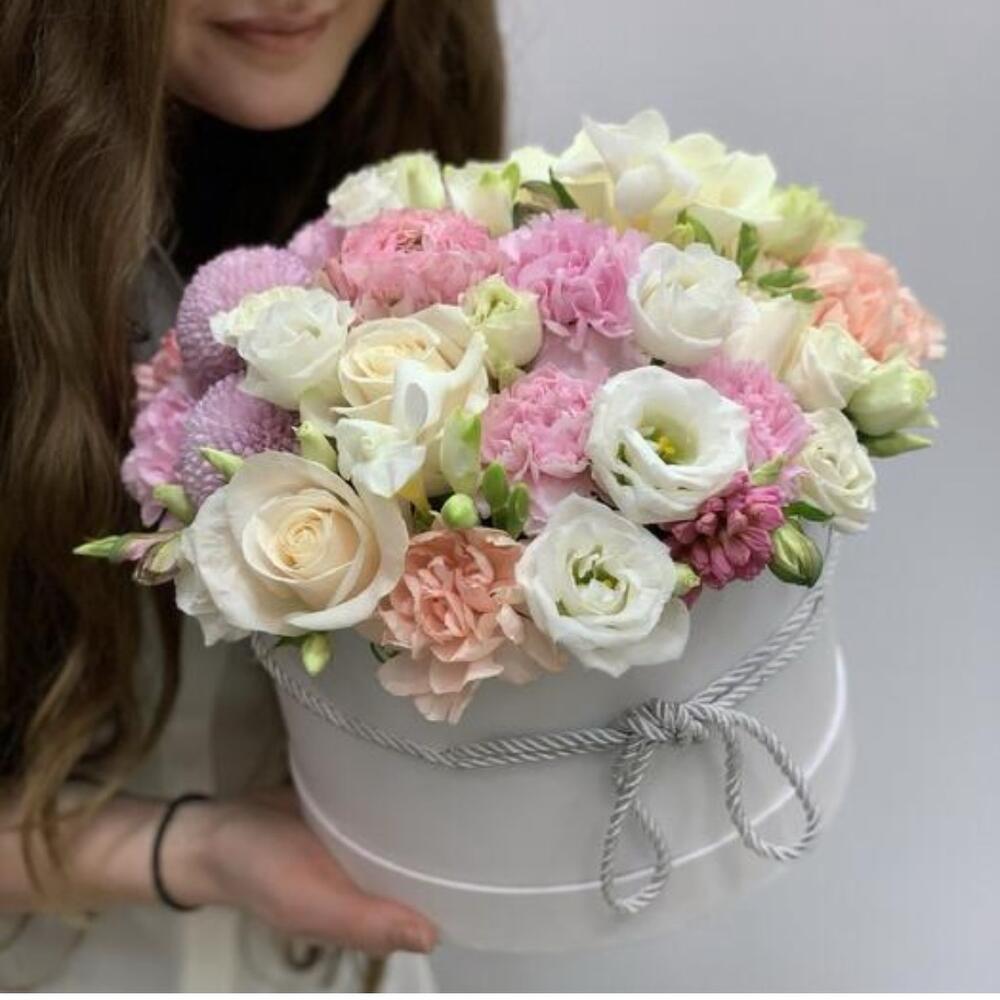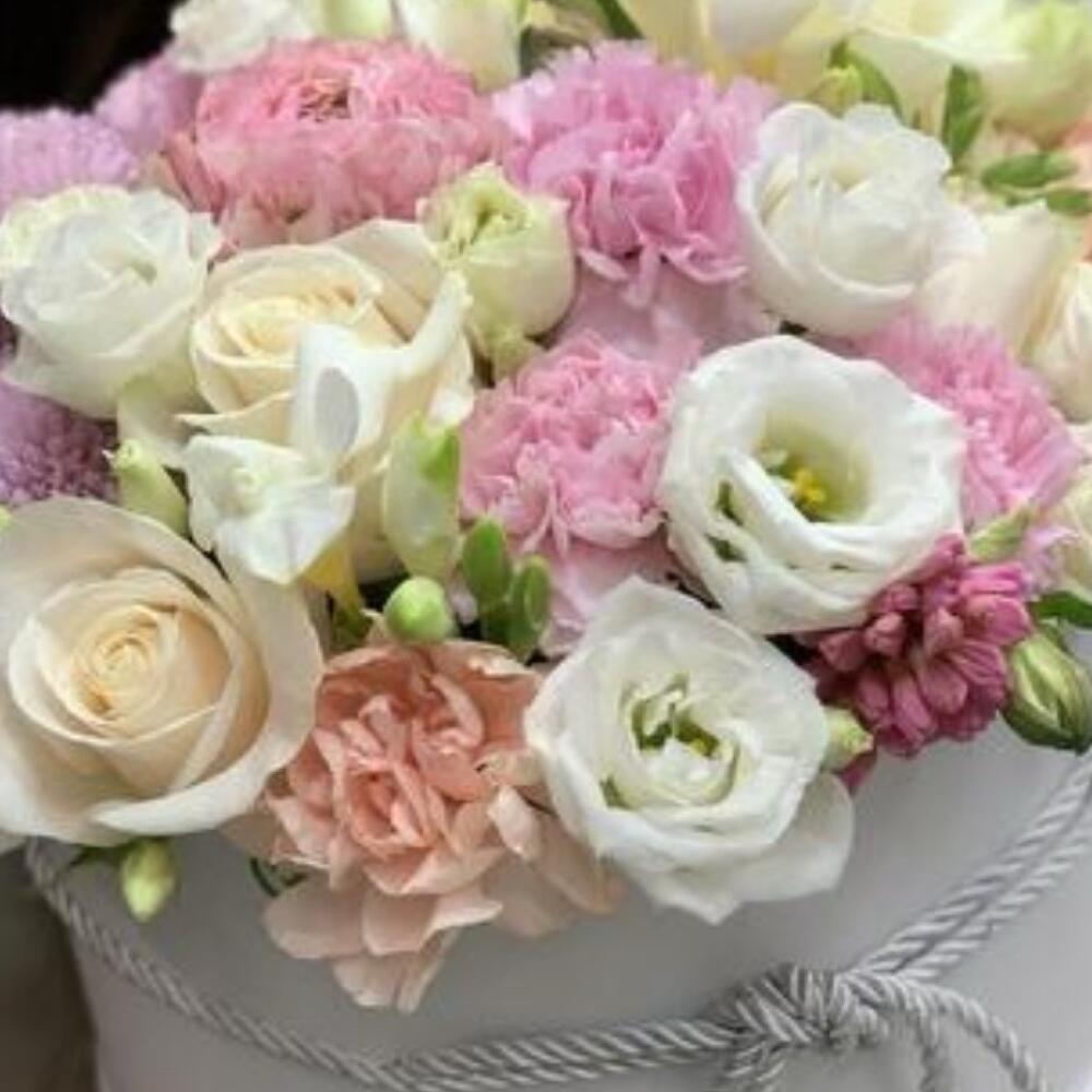White rose - 3 pcs white alstroemeria - 3 pcs pink carnations - 5 pcs white eustoma - 4 pcs pink pong ping - 2 pcs