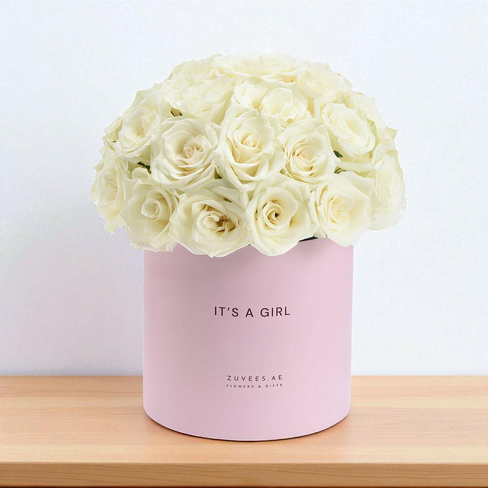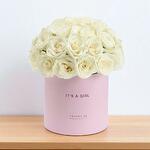 A breathtaking collection of pure white roses, this refined arrangement conveys serenity, admiration, and heartfelt emotions, making it a beautiful way to welcome a precious new life into the world.
