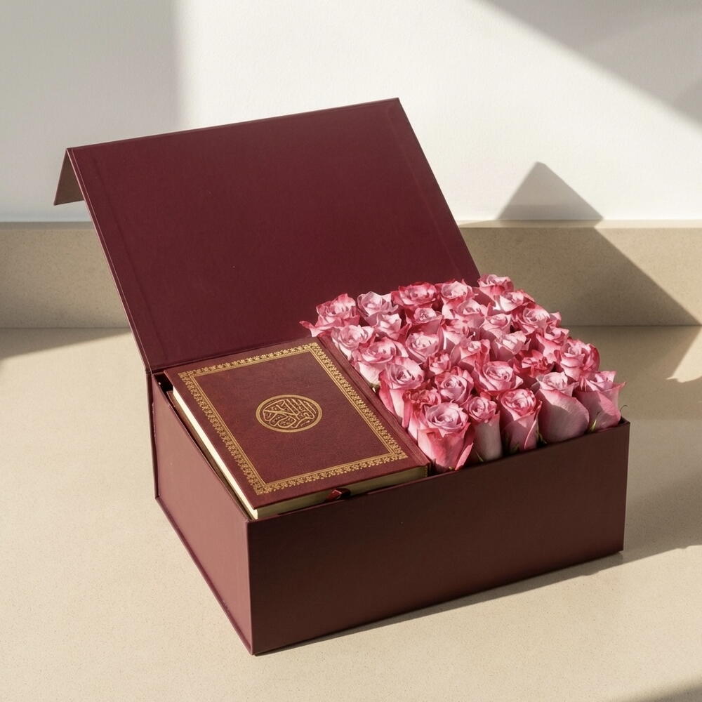 Honor the sacred spirit of Ramadan with the Noor Amethyst Roses Ramadan Hamper — a refined fusion of faith, elegance, and heartfelt appreciation. This luxurious gift set features 30 premium purple roses arranged in a lush display alongside a beautifully bound Quran Shareef, presented in a sophisticated burgundy hamper box. The deep violet tones symbolize dignity, reflection, and spiritual depth, while the Quran brings a meaningful, faith-centered presence to the gift. Perfect for Iftar gatherings, Ramadan gifting, and moments of gratitude toward parents, elders, mentors, or respected colleagues, this hamper embodies reverence and beauty in one harmonious presentation. Designed for both personal and corporate gifting, it offers a lasting impression that extends beyond the holy month.