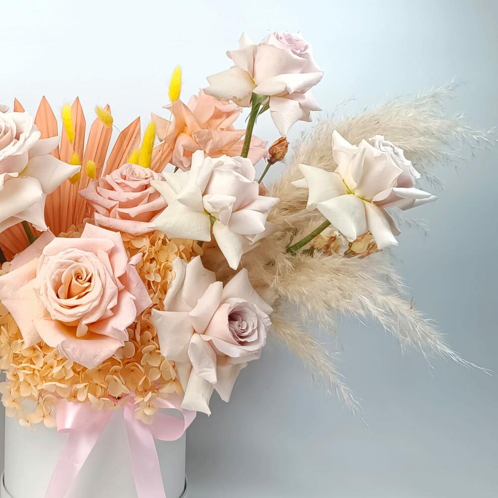 This Nude Box Arrangement is the ultimate modern-luxury Roses in a Box design—soft, classy, and beautifully “Instagrammable.” Styled in a premium hatbox with a satin ribbon, it features fresh premium nude/ivory roses (champagne-blush roses), paired with textured dried pampas grass, warm-toned dried fan palm accents, and a fluffy base of hydrangea for extra volume and softness. It’s a stylish Pastel Color bouquet in box form—minimal, elegant, and very trending. Perfect for birthday flowers / flowers for birthday and high-end birthday gifts, it’s also ideal for best flowers for anniversary, engagements, bridal showers, and chic wedding flowers arrangement gifting. Crafted as a fresh bouquet with premium quality flowers, this premium flowers bouquet is a truly unique flowers bouquet—a standout choice for anyone searching for the best bouquet in Dubai with a premium designer vibe.
