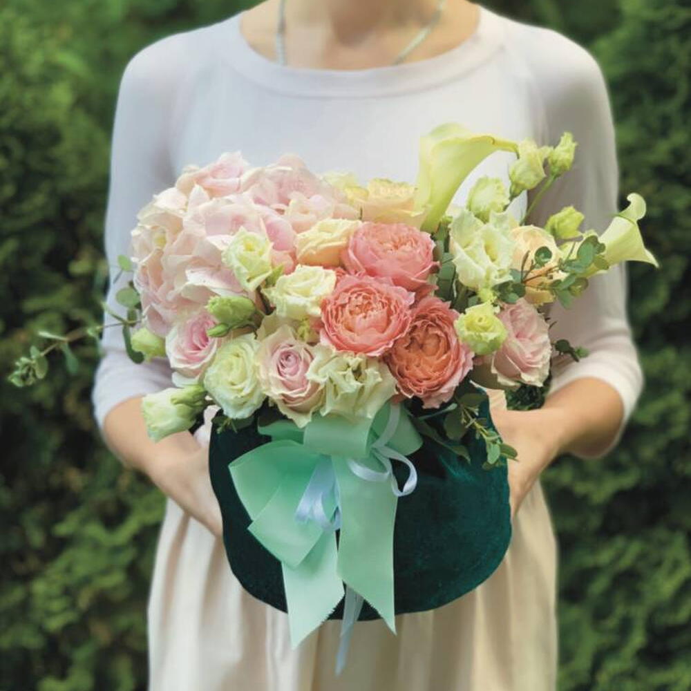 Composition: Hydrangea - 1, Spray Rose Julieta peach - 2, Calla - 2, Rose Ecuador Faith light purple - 3, Lisianthus - 2, Rose Kimberli - 3, Eucalyptus - 1, velvet bag - 1, ribbon - 2 Sizes: WIDTH - 25CM; HEIGHT - 25CM; LENGTH - 25CM; (including packaging) Size: 25 x 25 x 25 cm
