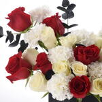white carnations - 9 pcs black eucalyptus - 4 pcs red roses - 10 pcs white roses - 10 pcs