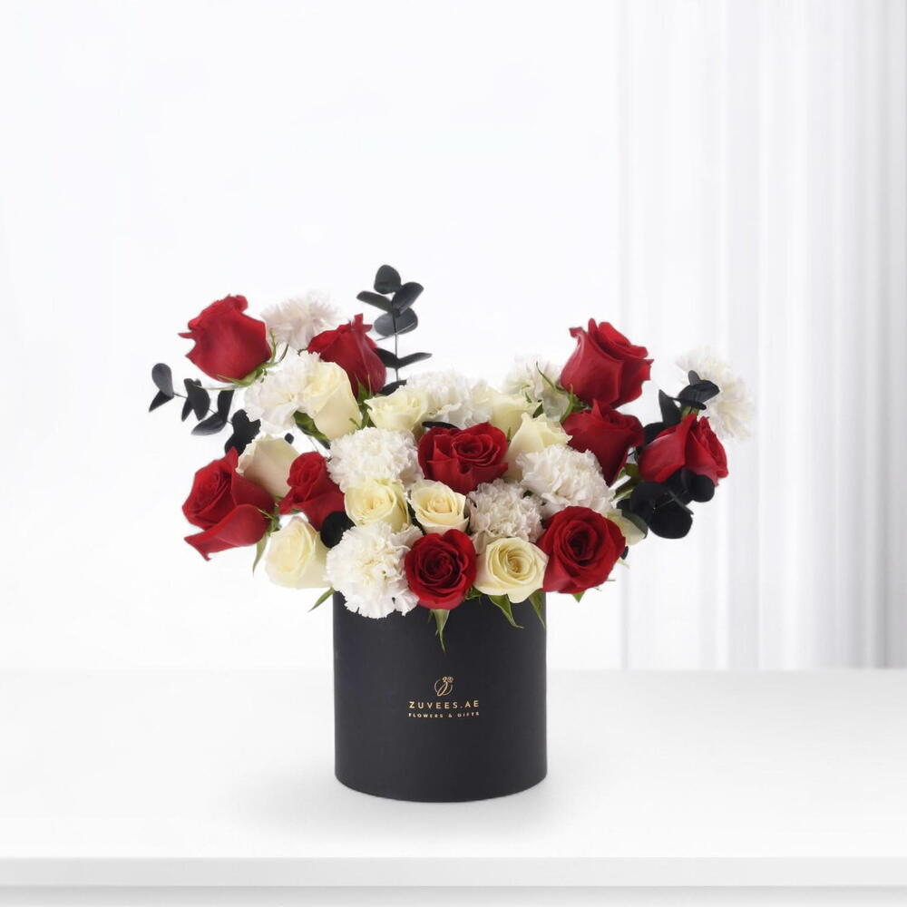 This refined arrangement features 10 red roses symbolizing deep affection, paired with 10 white roses representing purity and unity. Accented with 9 white carnations for softness and 4 black eucalyptus stems for depth and structure, it reflects harmony, elegance, and emotions. Available in Black Box.