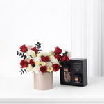 This refined arrangement features 10 red roses symbolizing deep affection, paired with 10 white roses representing purity and unity. Accented with 9 white carnations for softness and 4 black eucalyptus stems for depth and structure, it reflects harmony, elegance, and emotion. Paired with luxurious Lakrids Salt Caramel Chocolate, this indulgent combo blends romance and sweetness — the perfect gesture for love, gratitude, or celebration.