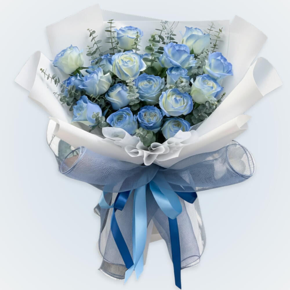 15 stem blue colour paint rose, 10 stem eucalyptus,