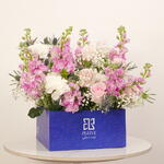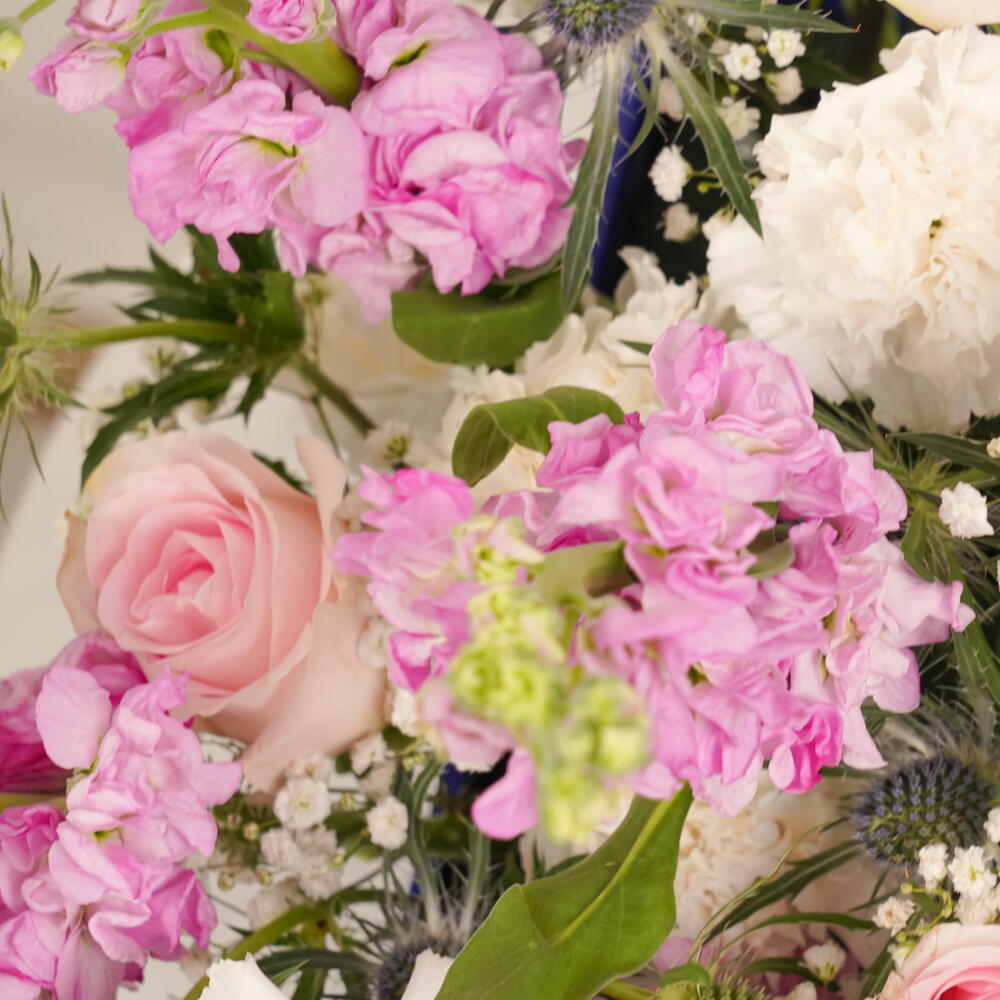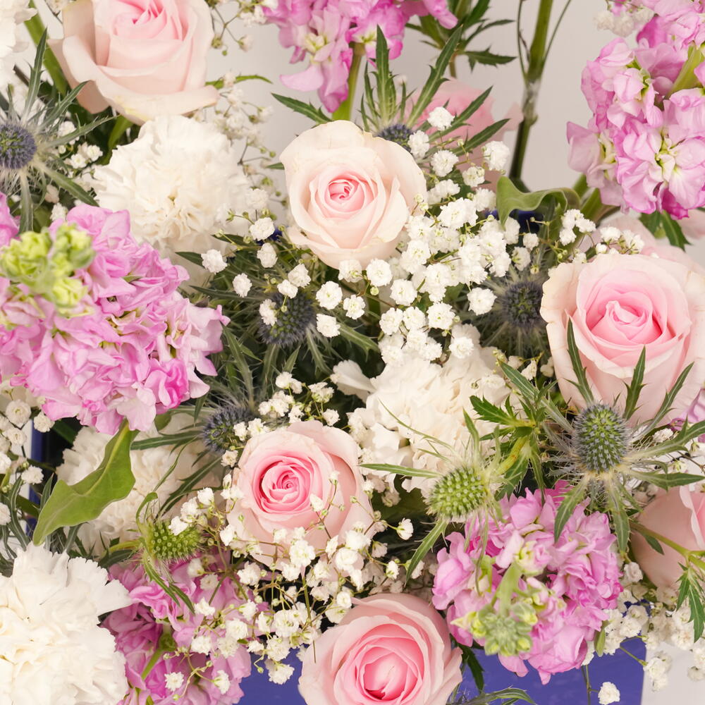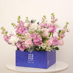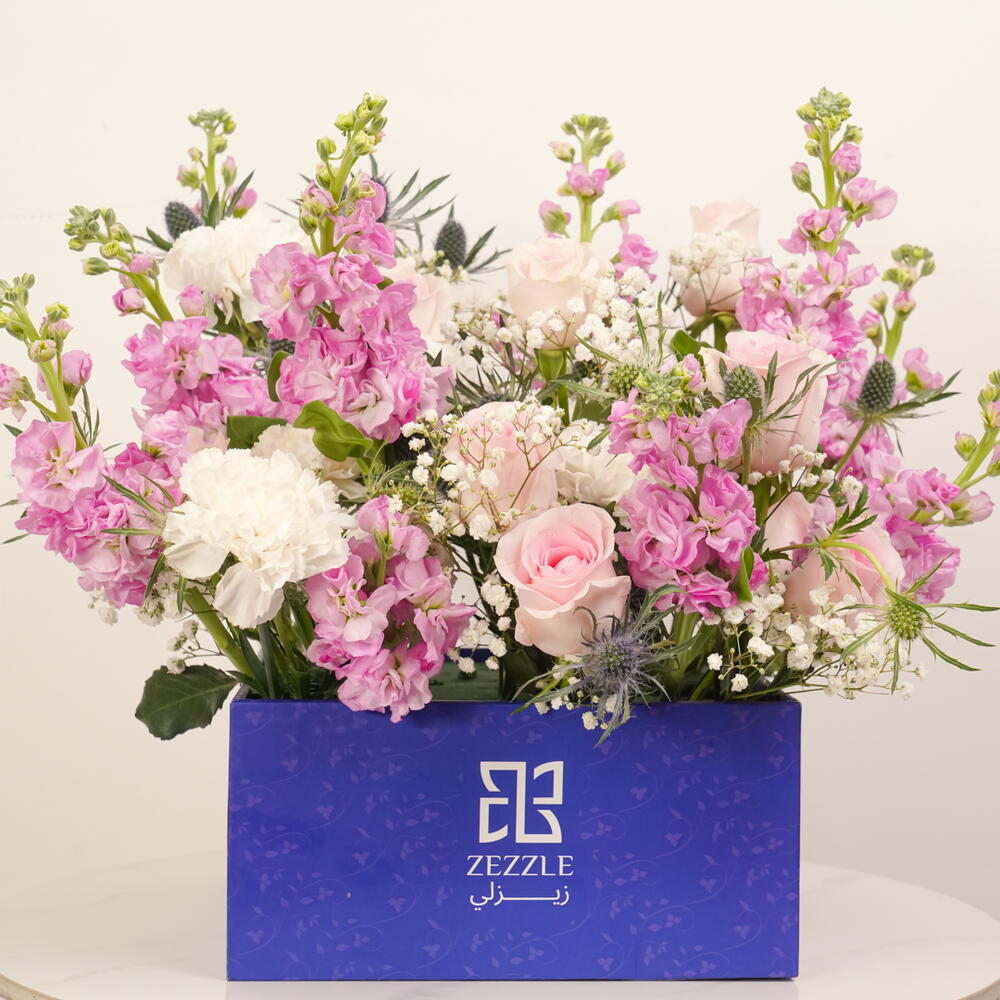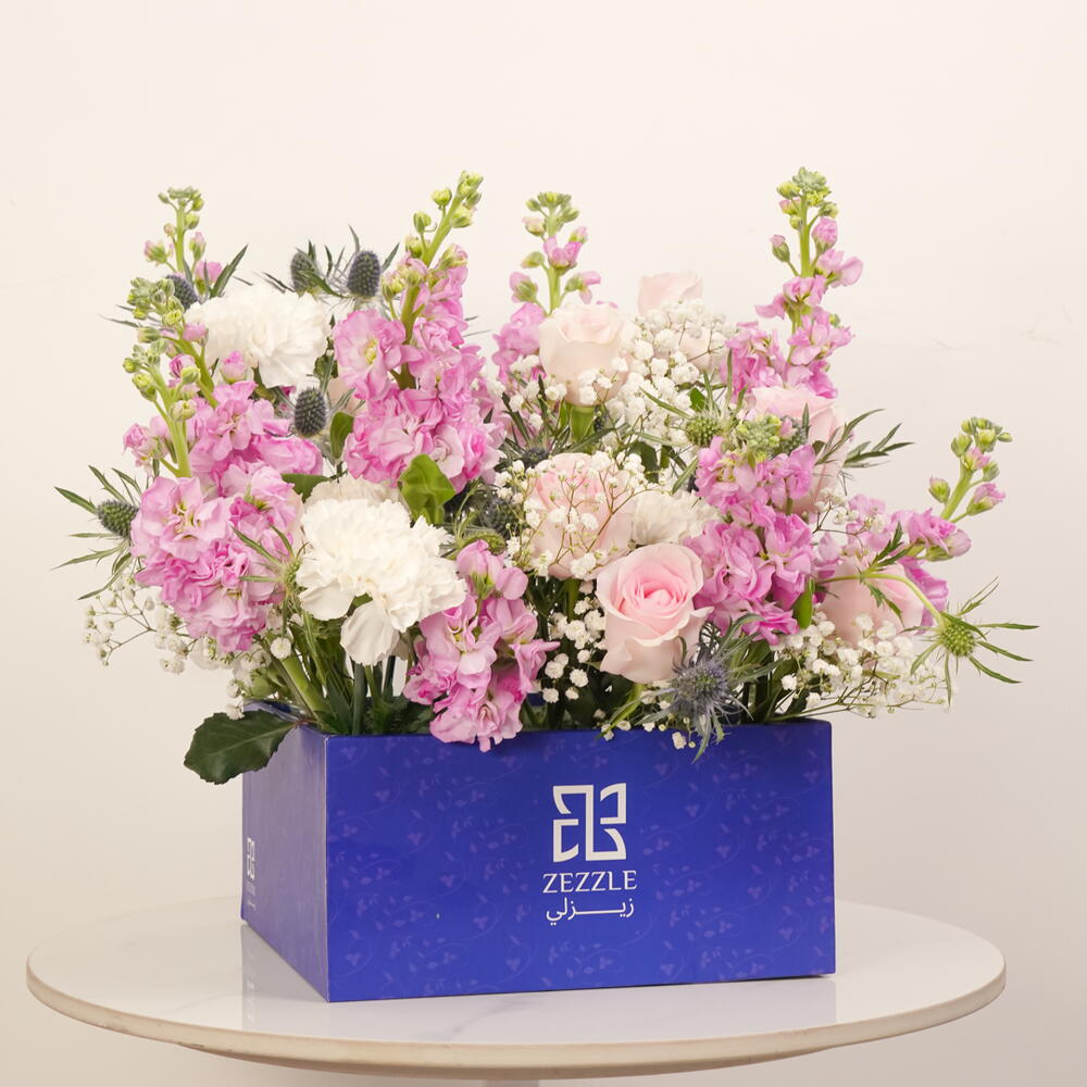 Enjoy the freshness of Ocean Breeze, a luxurious bouquet featuring 10 pink matthiolas, 10 pink roses, 10 white carnations, 10 gypsophila, and 5 blue eryngium, elegantly arranged in a blue Zezzle square box. Perfect for gifts and special occasions, delivered across the UAE.