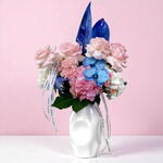 rose pink - 5 pcs hydrangea pink - 2 pcs carnation pink - 6 pcs hydrangea white - 2 pcs ceramic vase - 1 pcs spray rose pink - 6 pcs