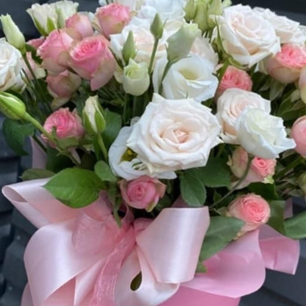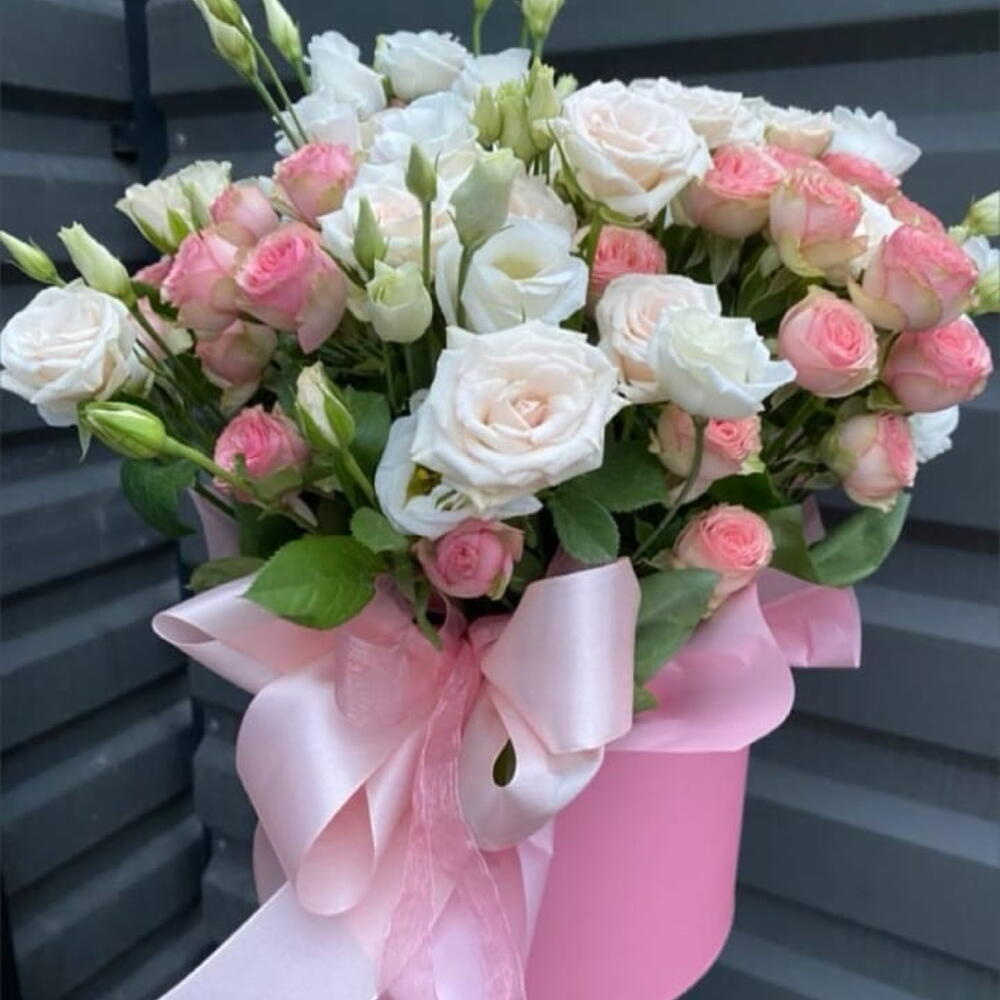 pink spray rose - 4 pcs white lisianthus - 3 pcs peach spray roses - 4 pcs round box hat - 1 pcs