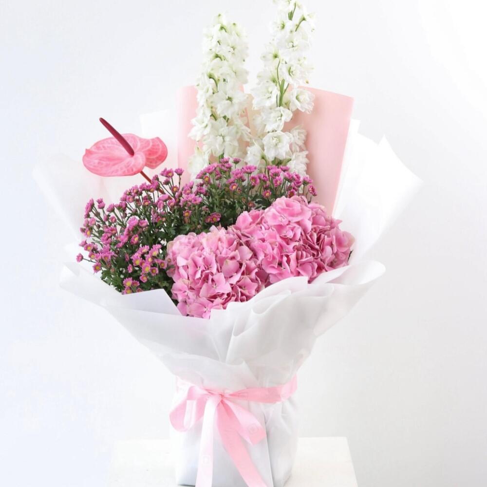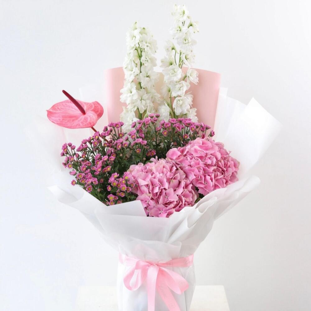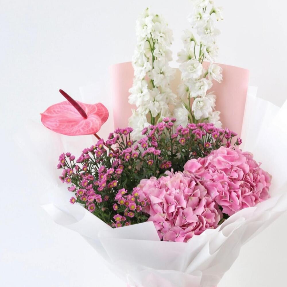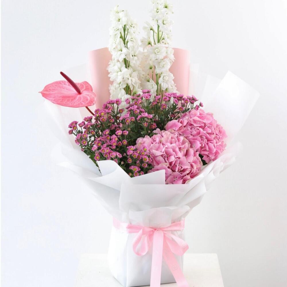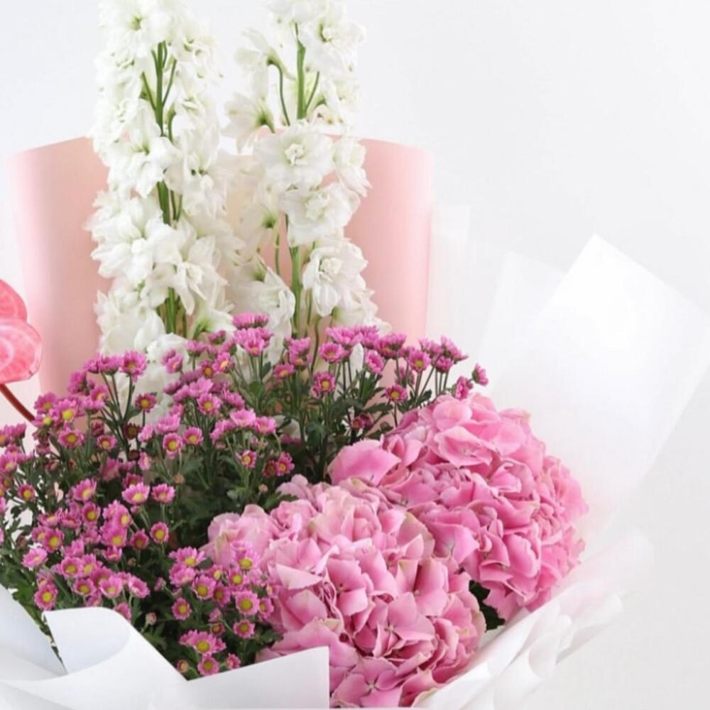 Odessa Bloom 🌸 Composition: • 2 White Delphiniums • 1 Pink Anthurium • 2 Pink Hydrangeas • Pink Wax Flowers • Wrapped in white pink paper, tied with pink satin ribbon A soft, romantic bouquet in whites and pinks. White delphiniums bring elegance, pink hydrangeas add lush fullness, a single pink anthurium adds charm, and pink wax flowers provide delicate accents. Perfect for: Anniversaries, love notes, congratulations, or brightening someone’s day. Majd’s Note: “Odessa Bloom captures a gentle, uplifting moment—perfect for those you cherish.”