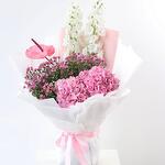 Wax flower - 30 pcs hydrangea pink - 2 pcs white delphinium - 2 pcs pink anthurium - 1 pcs