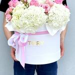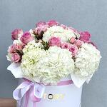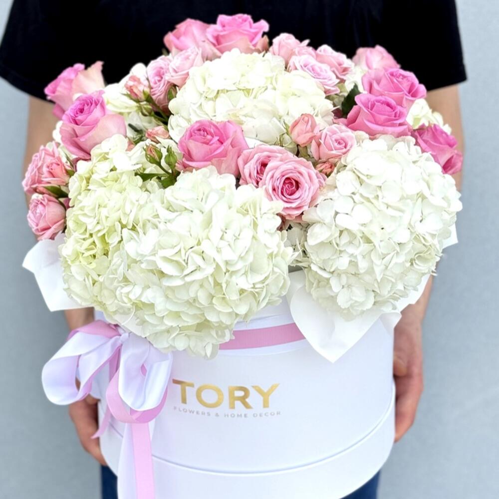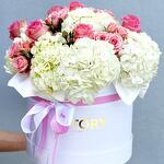 Composition: Hydrangea - 7, pink rose - 12, Spray Rose Odilia light pink - 6, oasis - 1, box - 1 Sizes: WIDTH - 25CM; HEIGHT - 30CM; LENGTH - 30CM; (including packaging) Size: 25 x 30 x 30 cm