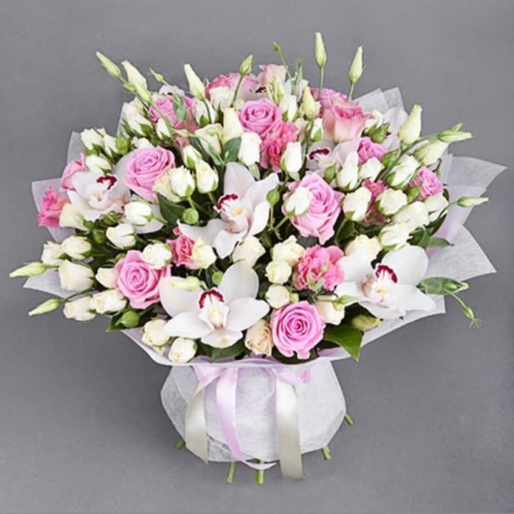 pink carnations - 10 pcs white cymbidium orchids - 6 pcs wrapping paper - 5 pcs white lisianthus stems - 5 pcs white spray roses - 10 pcs wam pink rose - 15 pcs