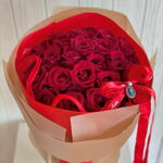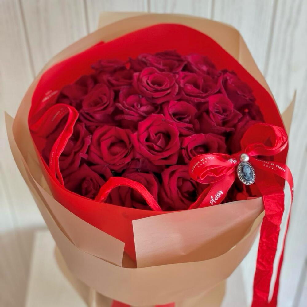 25 strong and stunning red roses wrapped elegantly and adorned with red velvet ribbons and cameo, makes this a beautiful and thoughtful gift!