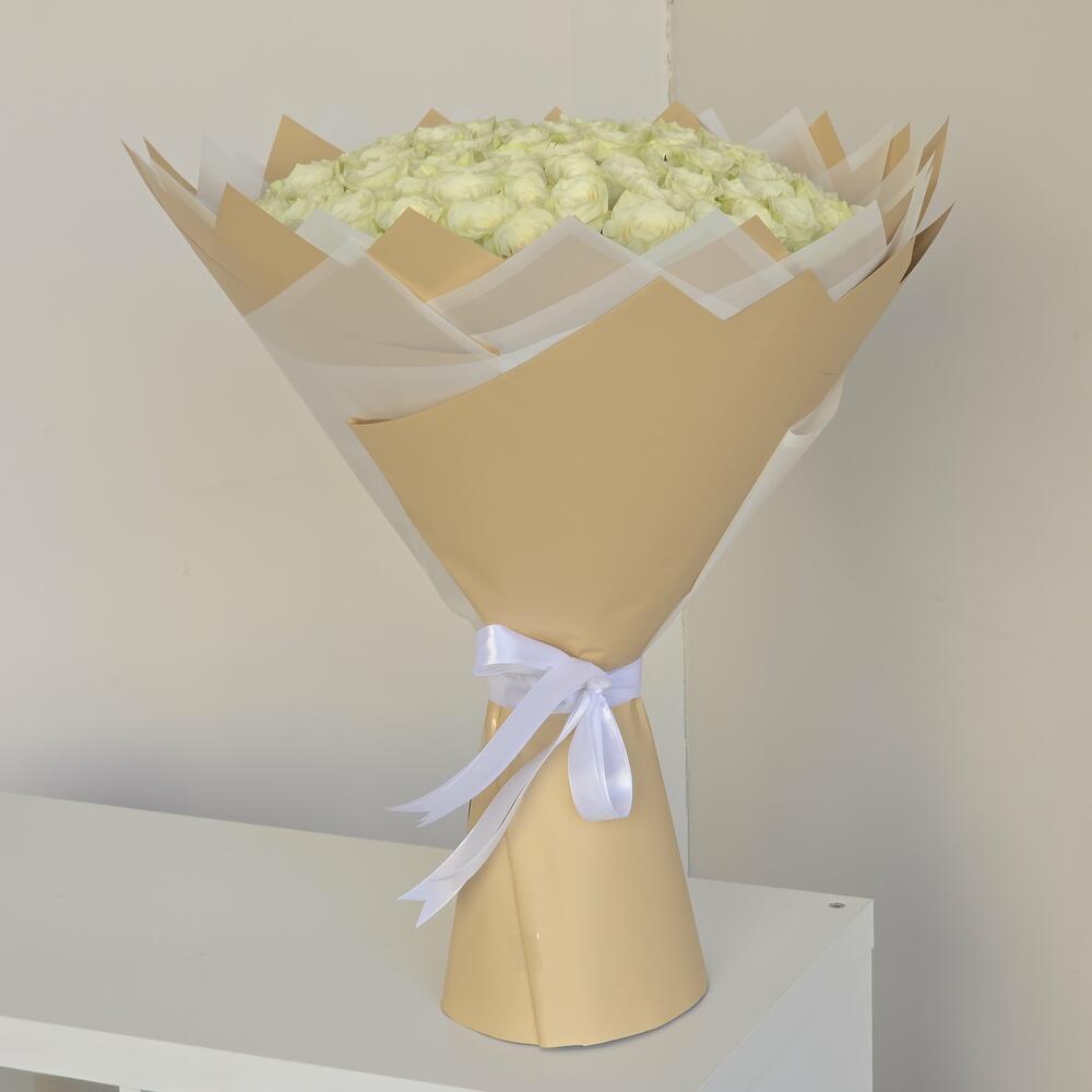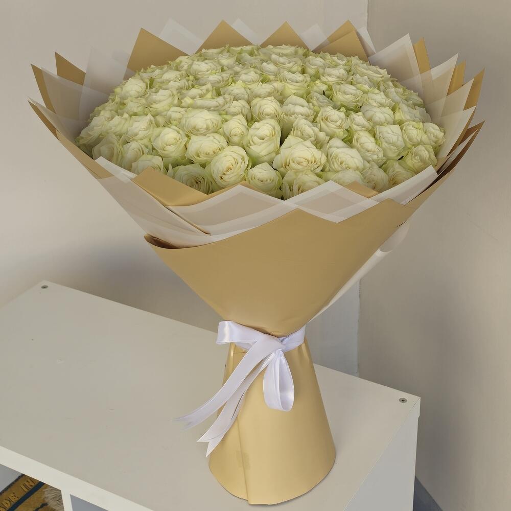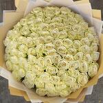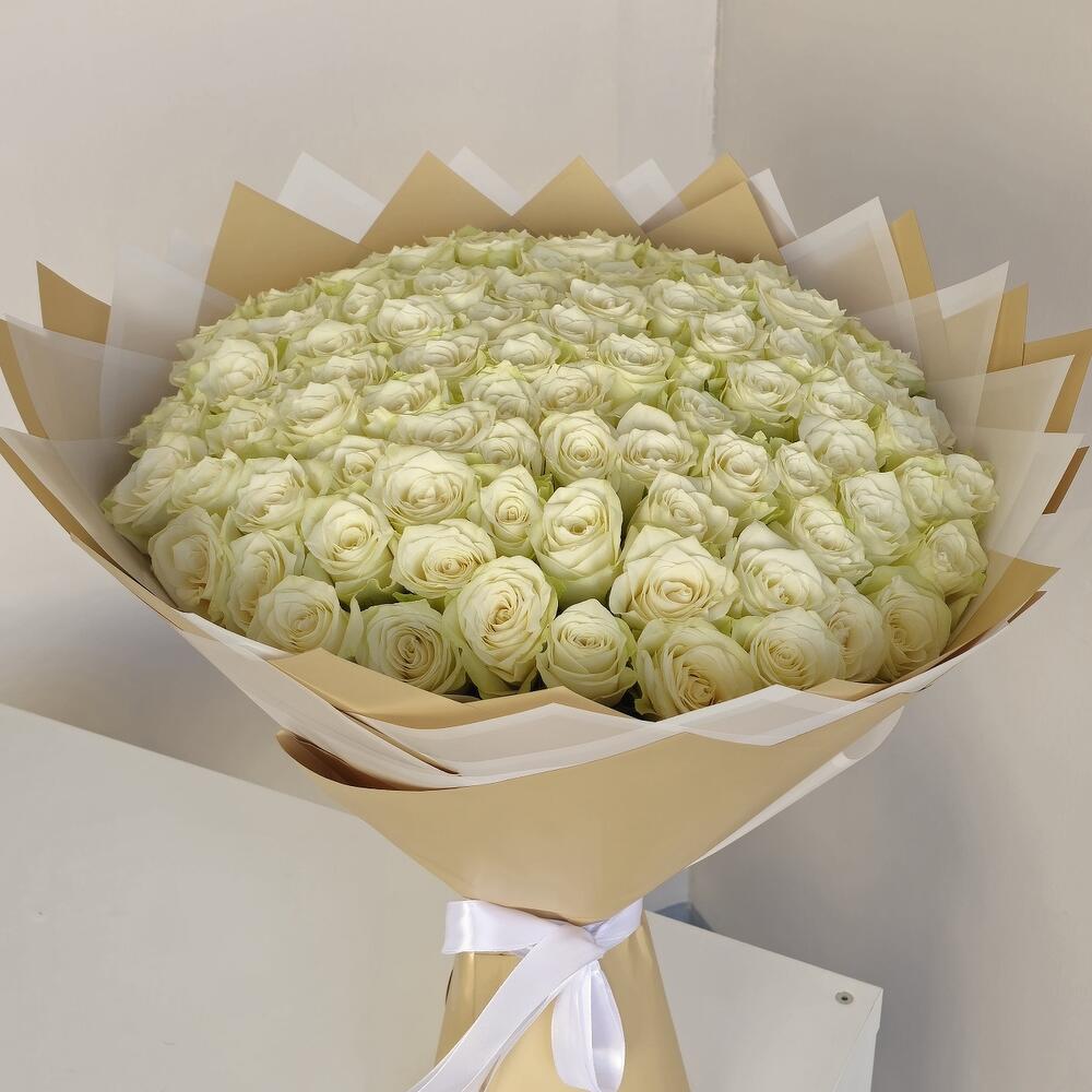 101 Off-White Roses – Timeless Elegance A breathtaking arrangement of 101 off-white roses, symbolizing purity, grace, and eternal love. Beautifully wrapped in a delicate blend of light gold and white wrapping paper, finished with a soft white ribbon for a luxurious touch. Perfect for grand romantic gestures, weddings, or any occasion that calls for elegance and charm.