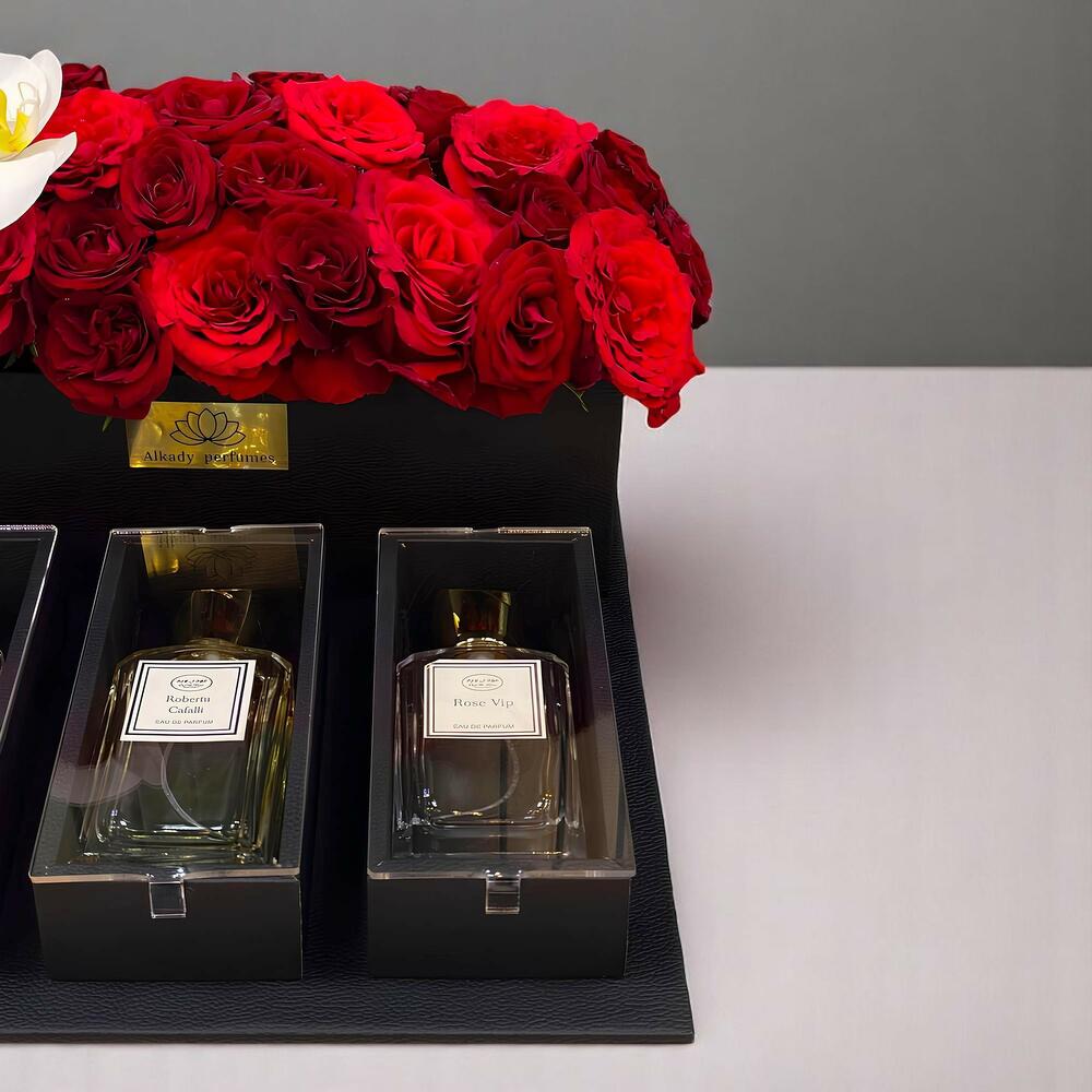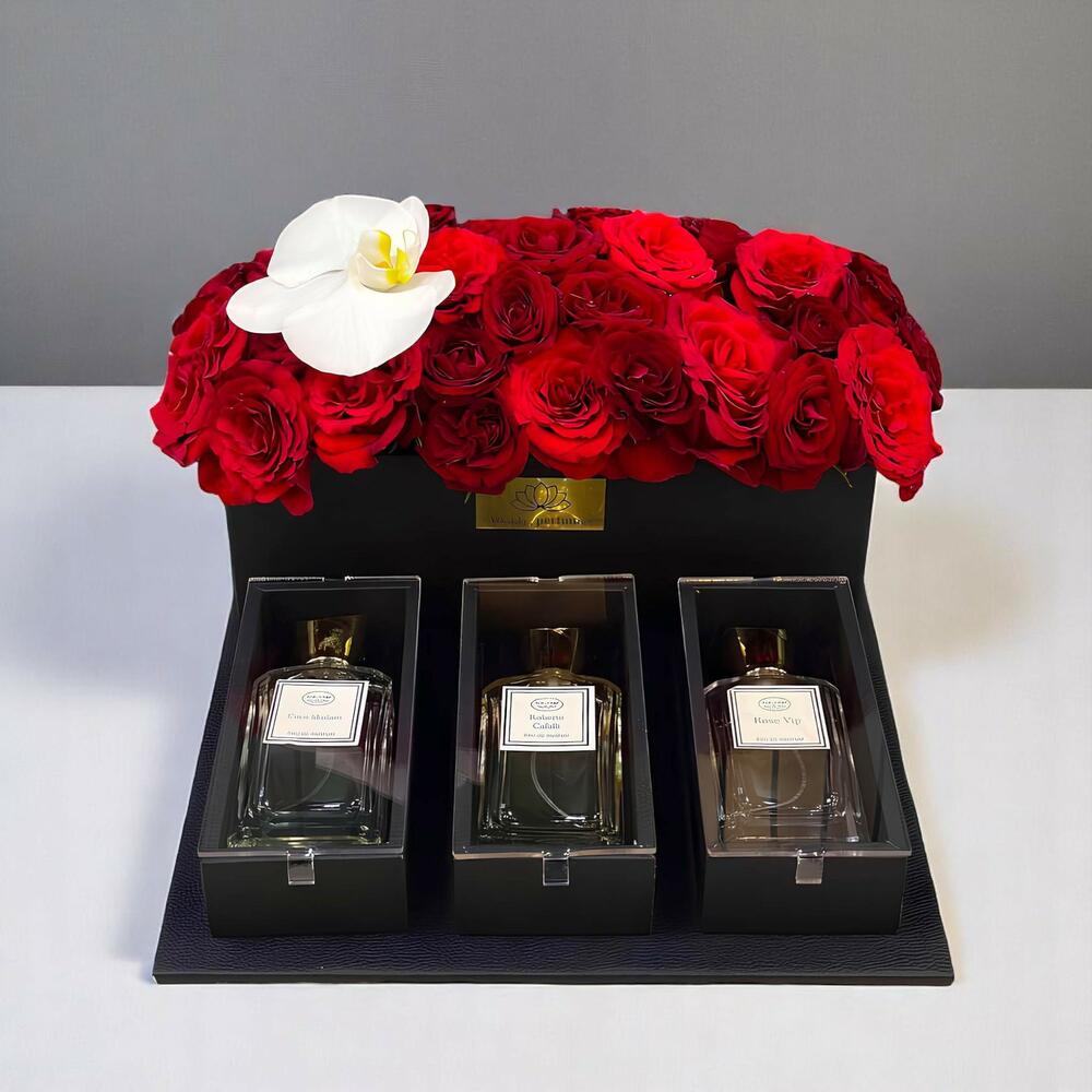 white orchid - 1 pcs red roses - 15 pcs international fragrances - 3 pcs