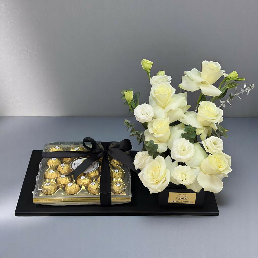 white stoma - 2 pcs white roses - 6 pcs box of ferrero rocher chocolates - 1 pcs and eucalyptus surround - 2 pcs