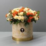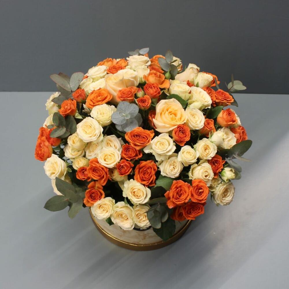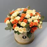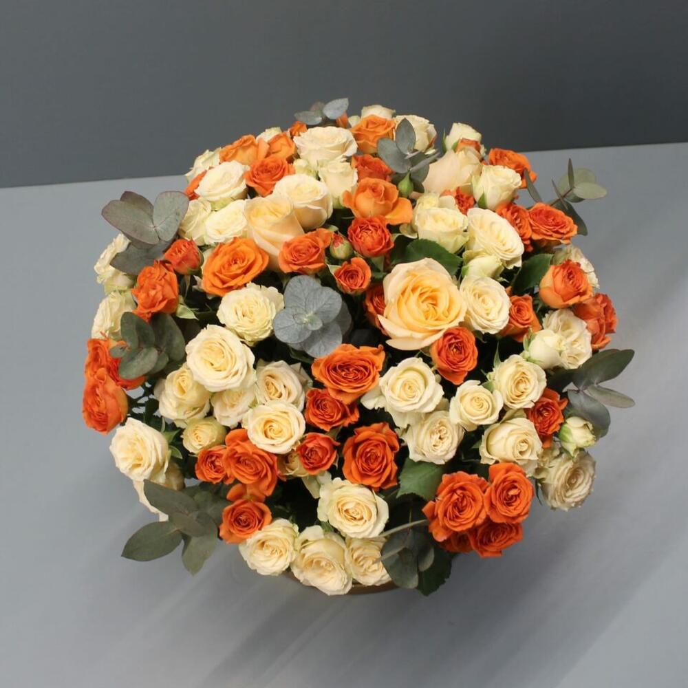 Elevate any occasion with our stunning flower delivery featuring 10 each of peach and orange spray roses artfully arranged alongside fragrant eucalyptus leaves in a stylish box. Radiating warmth and joy, these roses symbolize appreciation, friendship, and new beginnings, making them a versatile choice for any celebration. Handpicked for their vibrant hues and delicate blooms, each rose exudes natural beauty and charm, while the eucalyptus leaves add a refreshing touch. Whether its a birthday, anniversary, or simply a gesture of admiration, this enchanting arrangement is sure to delight and leave a lasting impression on your loved ones.