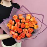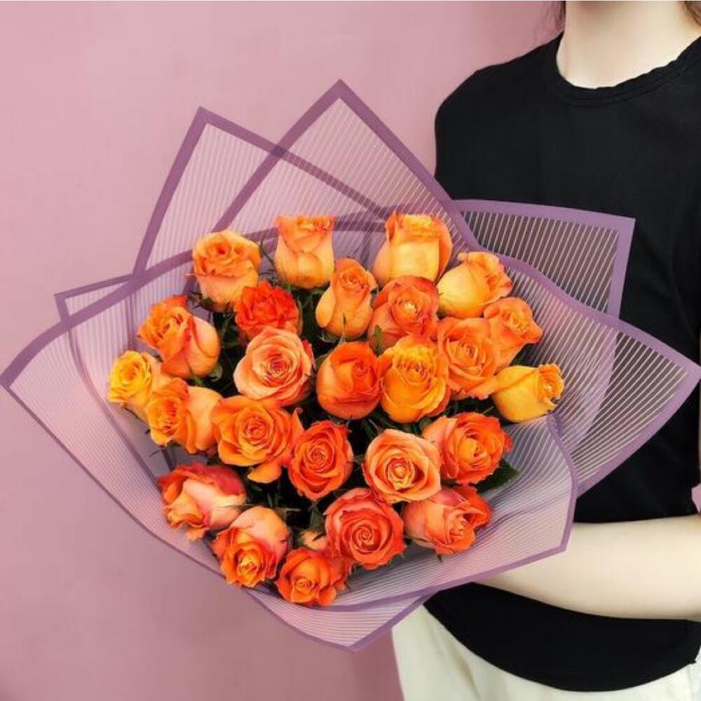 29 orange bouquets in purple wrapping