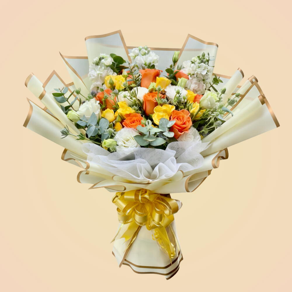 6 white mathiola, 5 stem orange rose, 3 stem yellow chrysanthemum, 3 stem white lisianthus