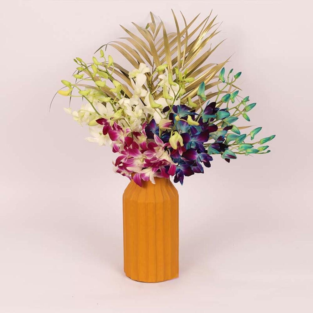 5 White Orchid, 5 Blue Orchid, 5 Purple Orchid, 2 Golden Sprayed Palm Leaves, Prepared in a Premium Yellow Ceramic Glass Vase - 11.5x20cm.