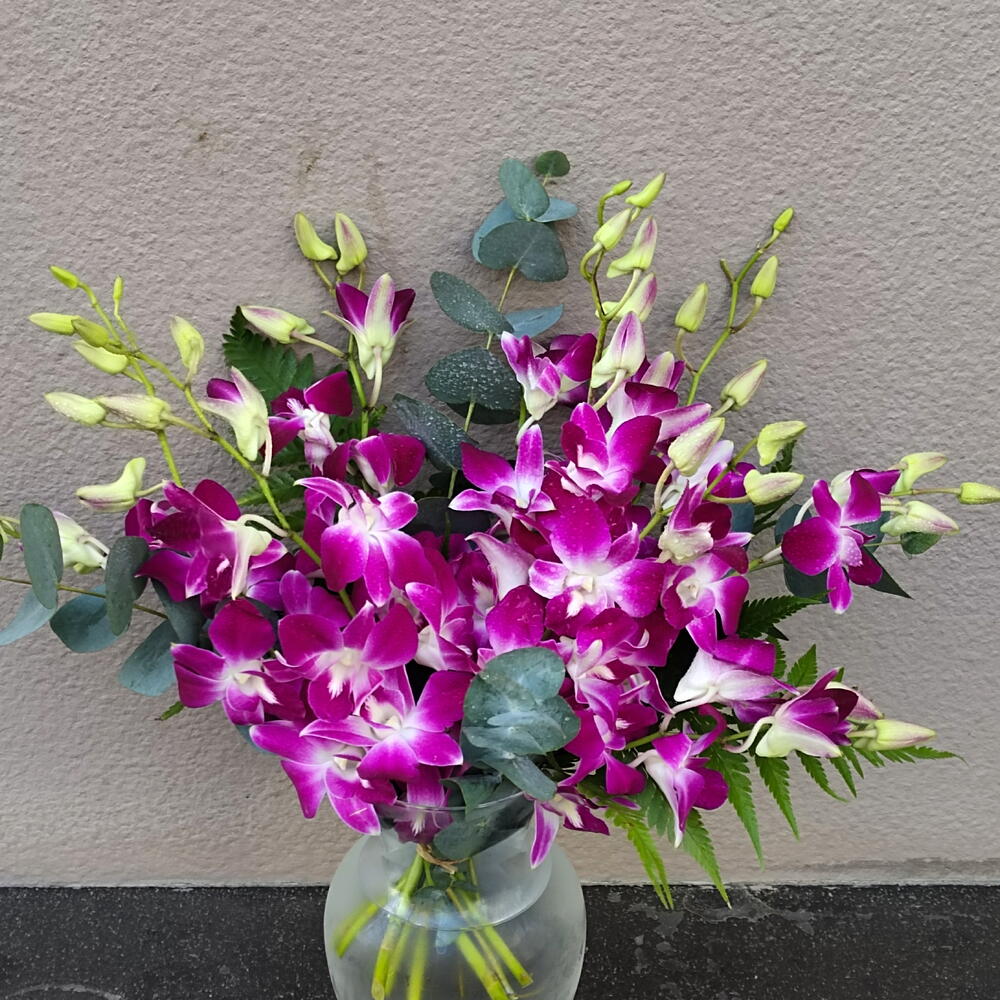Orchids Vase:20 Stems Of Purple Orchids in a Glass Vase When its time to celebrate, choose a vibrant, happy lavender orchid, presented in a charming garden vase. Its the perfect pick-me-up for any occasion.