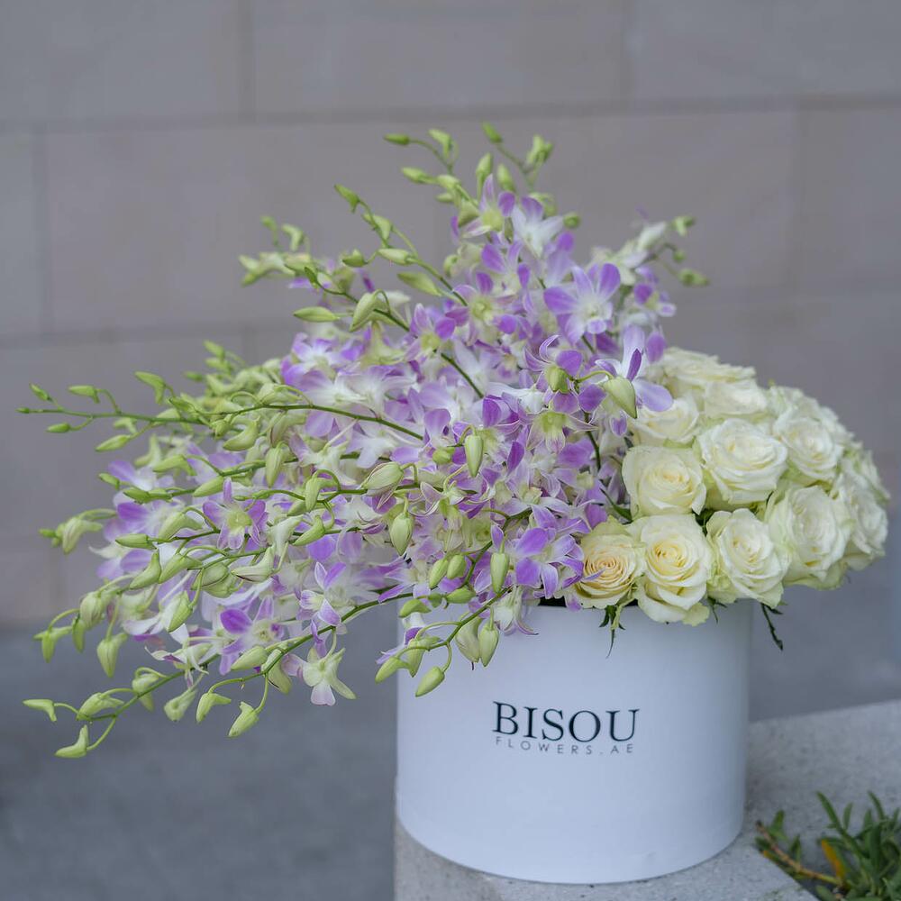 Box arrangement of 20 stems of purple orchid and 20 stems of white roses in a white box