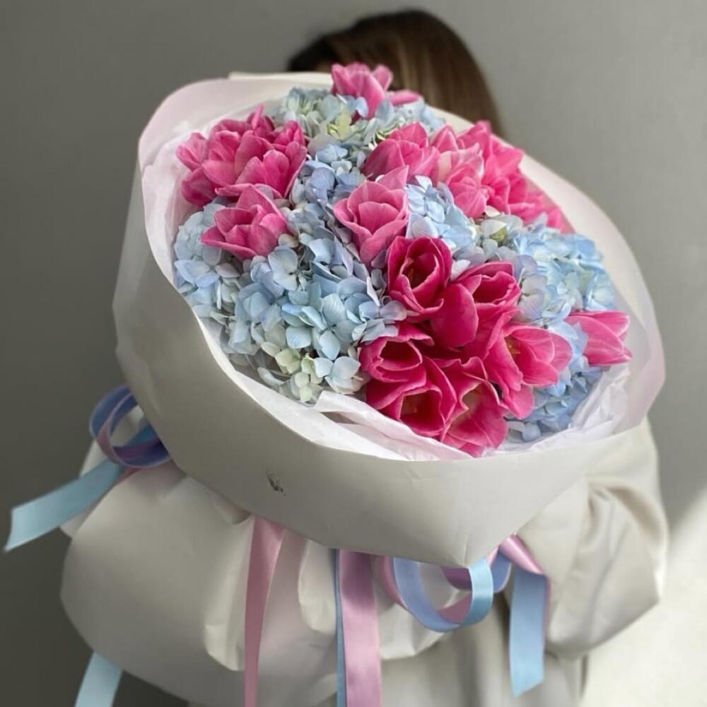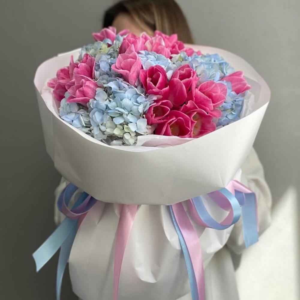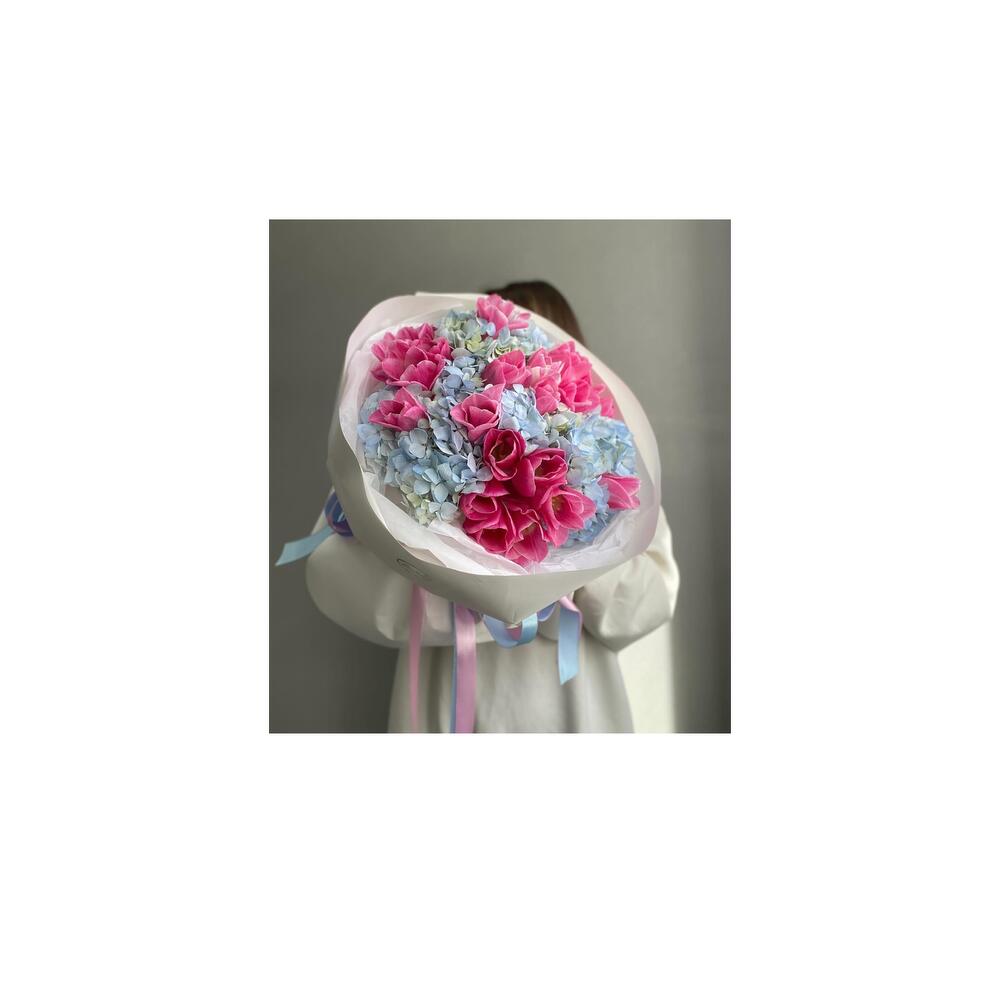 pink tulip - 20 pcs blue hydrangea - 4 pcs