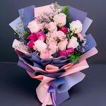pink roses - 7 pcs white roses - 7 pcs purple roses with filler - 7 pcs blue and pink warping - 5 pcs