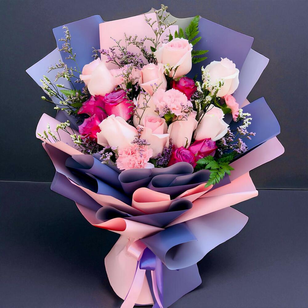 Light Pink 10Nos, Pink Carnations 5Nos ,Purple Rose 6Nos