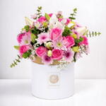Brighten someone’s day with this vibrant and joyful flower arrangement, elegantly presented in a white hat box. A charming medley of pink roses, delicate lilies, playful chrysanthemums, and dainty baby’s breath creates a lively yet graceful composition. The bouquet bursts with color and texture, balanced with fresh green accents of eucalyptus and buds for a touch of modern flair. Ideal for birthdays, congratulations, or just because—this floral gift speaks of happiness, admiration, and thoughtful care. To extend freshness, lightly spray the flowers with water daily and keep the box in a cool place away from direct sunlight or heat. This blooming masterpiece is sure to fill any room with beauty and fragrance.