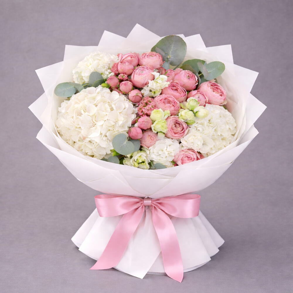 white hydrangeas blooming with julieta peony spray roses and lisianthus special with euclyptus leaves in white premium style wrapping bouquet.