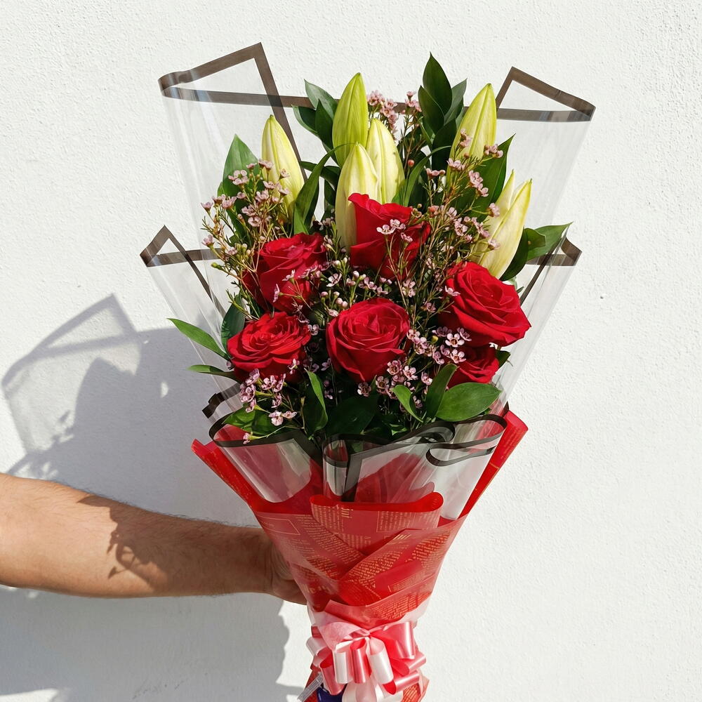 This elegant hand bouquet features rich red roses paired with creamy white lilies for a romantic, luxurious look. Wrapped in glossy clear and red printed sleeves with a layered pink and white ribbon bow, it creates a premium gift presentation. Includes fresh red roses, unopened white lilies, and delicate pink filler flowers for texture and volume. Arranged with lush green foliage to enhance contrast and make the blooms stand out.