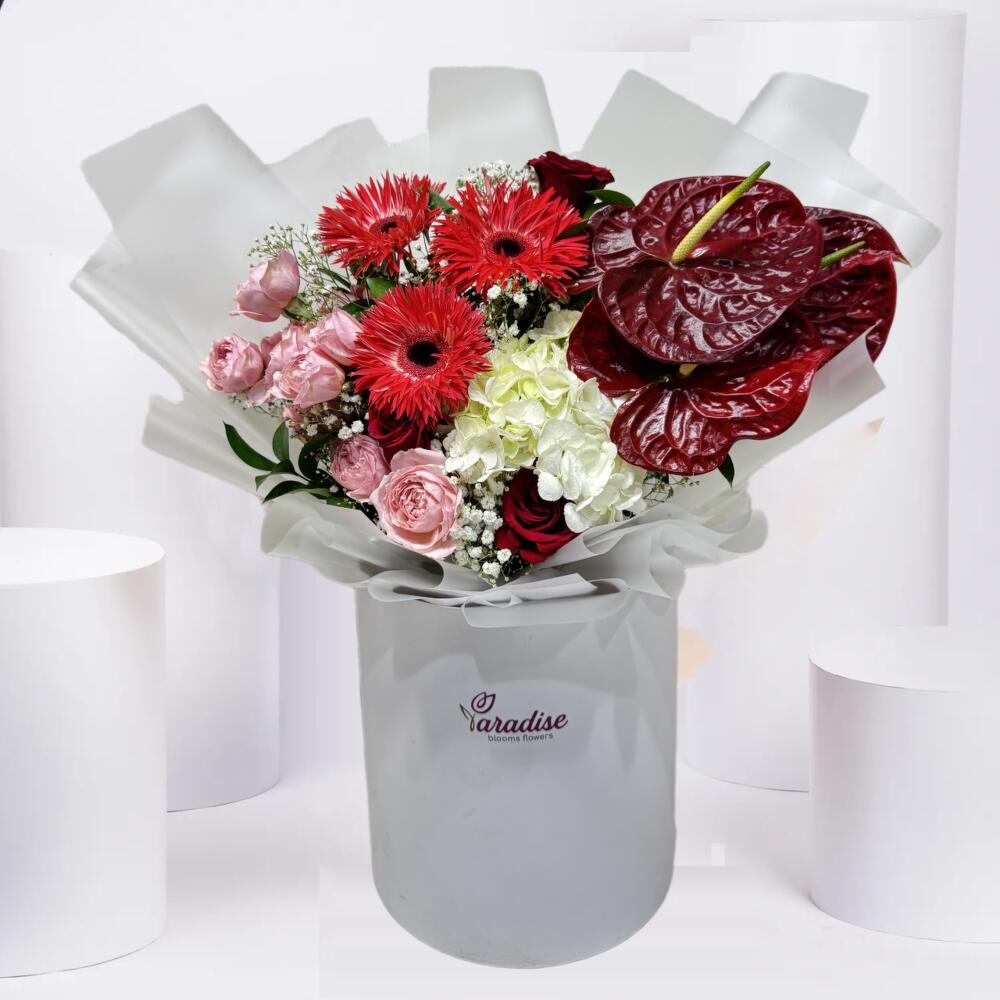 Red rose - 3 pcs Hydrangea - 1 pcs Gerbera - 3 pcs Anthurium - 2 pcs baby breath - 2 pcs juliet spray rose - 2 pcs