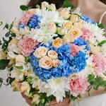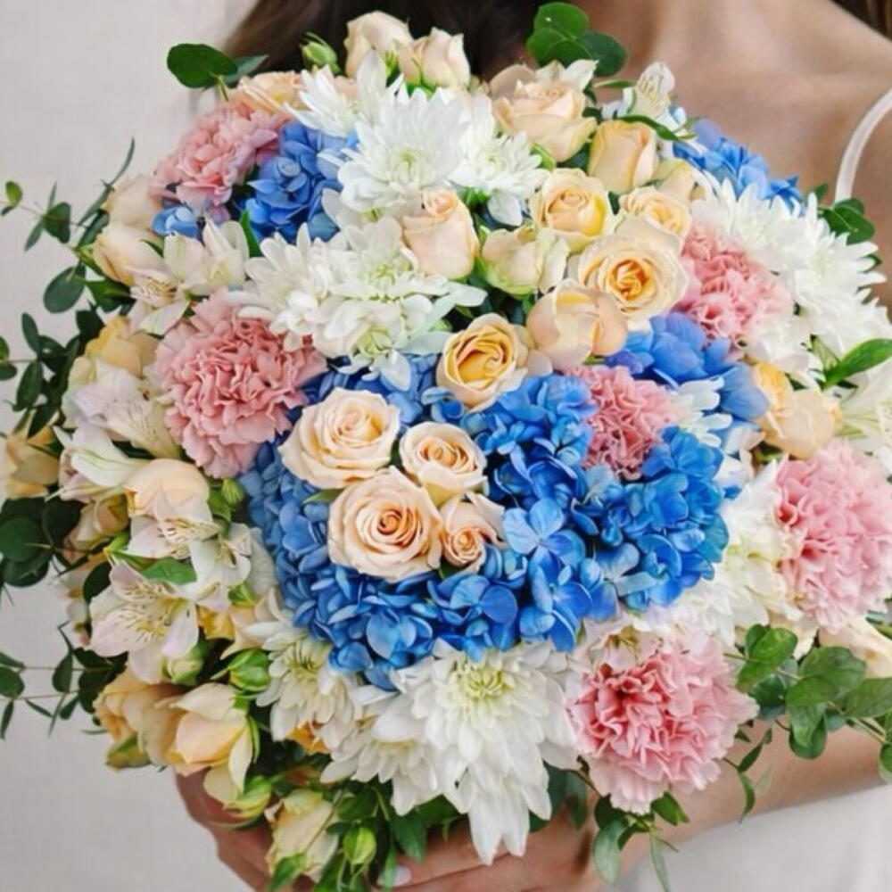 Chrysanthemum white - 6 pcs alstroemeria white - 5 pcs hydrangea blue - 3 pcs eucalyptus leaves - 6 pcs spray rose peach - 6 pcs carnation dark pink - 8 pcs