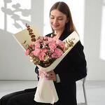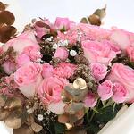 white gypsophila - 3 pcs pink roses - 15 pcs blush pink carnations - 5 pcs gold-tinted eucalyptus - 2 pcs golden ruscus - 2 pcs