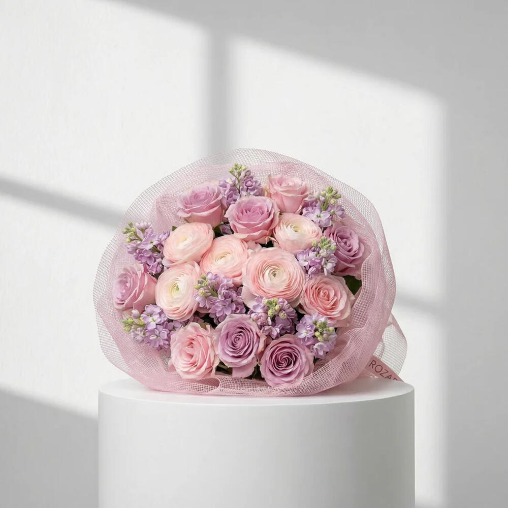 • A breathtaking architectural bouquet featuring a romantic blend of premium ranunculus and soft-toned roses. • Artfully layered with fragrant lavender stock and finished in our signature pink mesh cloud wrapping. • A sophisticated statement of modern luxury, designed to make an unforgettable impression for any celebration. • Please Note: As flowers are natural products, actual colors may vary slightly from digital images due to seasonal growth and lighting conditions. We guarantee that the overall style and premium quality as well as freshness of your arrangement will always be maintained.