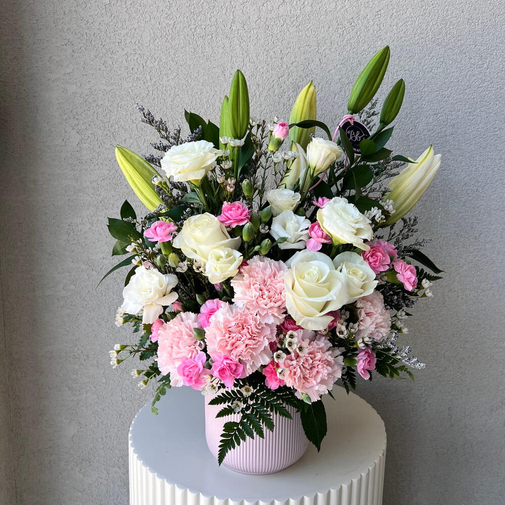 Indulge in the sheer elegance of our Florists Special selection. Wrapped in an eye-catching pink vase, this radiant bunch perfectly combines 2 exquisite lilies and 6 robust roses as the stars, accentuated by enchanting baby roses and an eclectic mix of white and pink carnations. Weve added 4 filler pieces to create an opulent and balanced composition that is sure to captivate. Ideal for all occasions, this bouquet merges classic beauty with a modern twist.