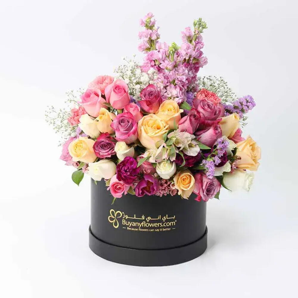 Product Details: 4 Stems Purple Tulips 7 Peach Roses 7 Purple Rose 7 Pink Rose 7 White Rose 3 Pink Matthiola 2 Stem Pink Alstroemeria 2 Purple Statice 2 Stem Pink Wax 3 Stem Gypsophilia Prepared in a Black Round Box