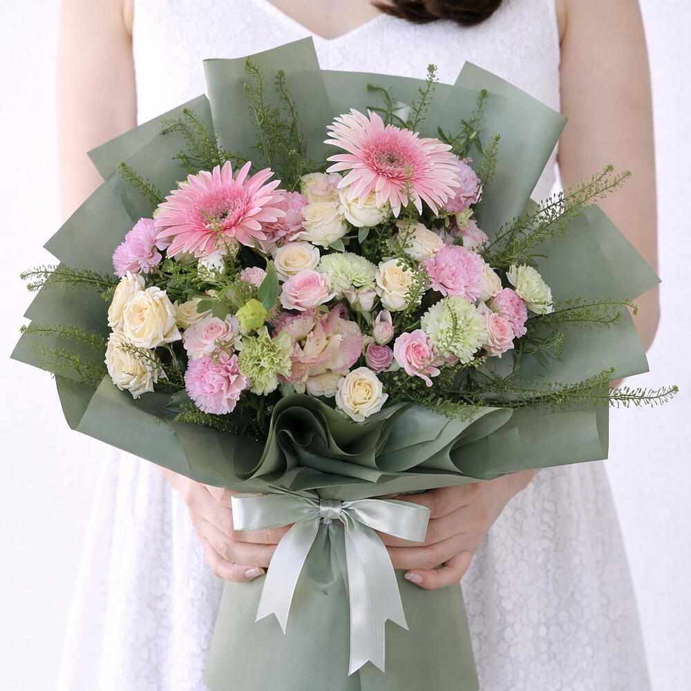 Pastel Garden Bouquet is a fresh and elegant arrangement in soft romantic tones. It features beautiful pink gerberas, baby pink spray roses, ivory roses, delicate lisianthus, and pink light green carnations, finished with fine greenery fillers for a natural garden look. Wrapped in stylish sage green paper with satin ribbon, this bouquet is perfect for birthdays, new baby, congratulations, anniversaries, or a sweet everyday gift. Baby roses / spray roses peach: 4 pcs Baby roses / spray roses (pink): 4 stems Gerbera (pink): 2 stems Lisianthus / Eustoma (light pink): 2 stems Carnations (pink + green): 5 stems Green fillers / foliage: 2 stems Purchase Note: Free Greeting Card Printing included with every order. (Please write your card message at checkout.) Flower Color Changes: You may request to change the flower colors to match your preference. This is subject to availability and may vary depending on daily stock. Add-Ons Available: You can add extra items such as: Balloons, letters, numbers, chocolates, perfumes, and gift items (optional). Freshness Guarantee: We always use fresh flowers and ensure the best possible arrangement quality.