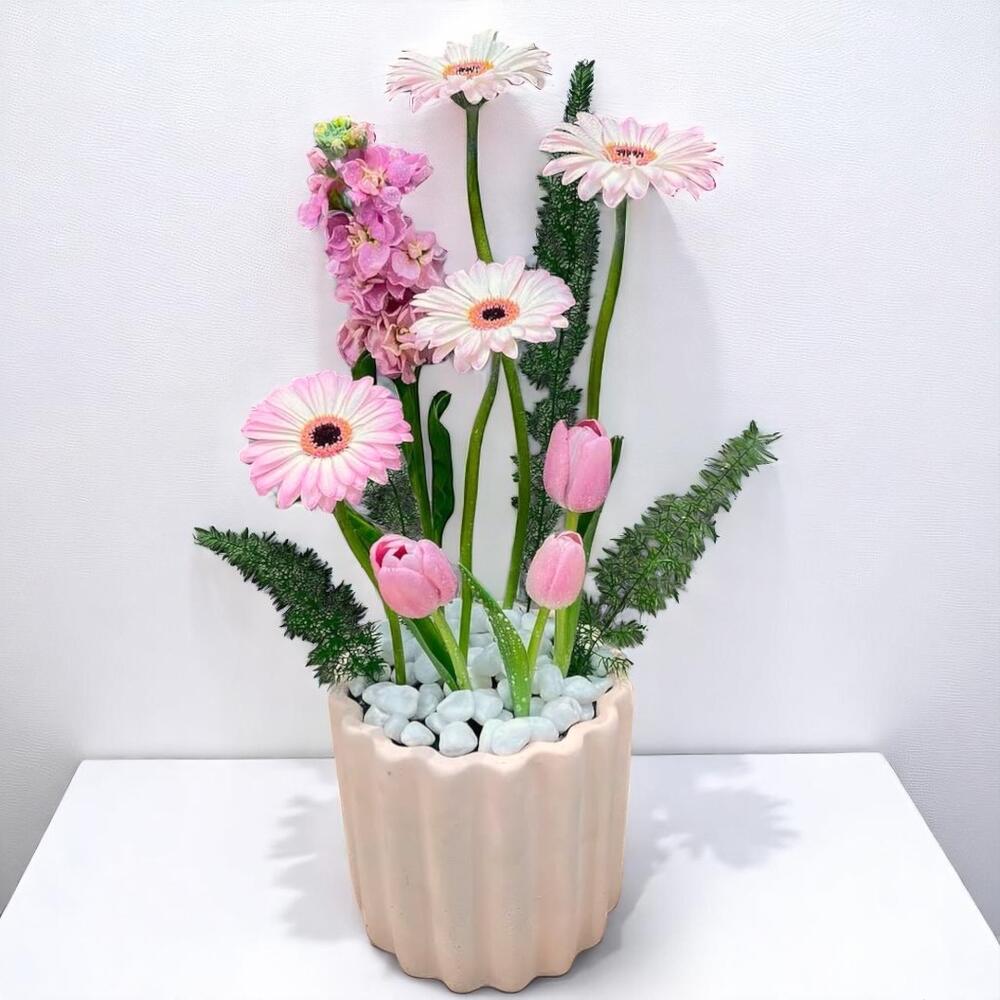 Pastel Garden Flower Arrangement in Ceramic Pot – Pink Tulips and Gerberas Floral Gift